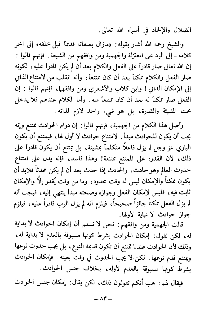 وَأَصْلُ هَذَا الْكَلَامِ مِنَ الْجَهْمِيَّةِ، فَإِنَّهُمْ قَالُوا: إِنَّ دَوَامَ الْحَوَادِثِ مُمْتَنِعٌ، وَإِنَّهُ يَجِبُ أَنْ يَكُونَ لِلْحَوَادِثِ مَبْدَأٌ؛ لِامْتِنَاعِ حَوَادِثَ لَا أَوَّلَ لَهَا، فَيَمْتَنِعُ أَنْ يَكُونَ الْبَارِي - عَزَّ وَجَلَّ - لَمْ يَزَلْ فَاعِلًا مُتَكَلِّمًا بِمَشِيئَةٍ، بَلْ يَمْتَنِعُ أَنْ يَكُونَ قَادِرًا عَلَى ذَلِكَ، لِأَنَّ الْقُدْرَةَ عَلَى الْمُمْتَنِعِ مُمْتَنِعَةٌ! وَهَذَا فَاسِدٌ، فَإِنَّهُ يَدُلُّ عَلَى امْتِنَاعِ حُدُوثِ الْعَالَمِ وَهُوَ حَادِثٌ، وَالْحَادِثُ إِذَا حَدَثَ بَعْدَ أَنْ لَمْ يَكُنْ مُحْدَثًا فَلَا بُدَّ أَنْ يَكُونَ مُمْكِنًا، وَالْإِمْكَانُ لَيْسَ لَهُ وَقْتٌ مَحْدُودٌ، وَمَا مِنْ وَقْتٍ يُقَدَّرُ إِلَّا وَالْإِمْكَانُ ثَابِتٌ فِيهِ، فلَيْسَ لِإِمْكَانِ الْفِعْلِ وَجَوَازِهِ وَصِحَّتِهِ مَبْدَأٌ يَنْتَهِي إِلَيْهِ، فَيَجِبُ أَنَّهُ لَمْ يَزَلِ الْفِعْلُ مُمْكِنًا جَائِزًا صَحِيحًا، فَيَلْزَمُ أَنَّهُ لَمْ يَزَلِ الرَّبُّ قَادِرًا عَلَيْهِ، فَيَلْزَمُ جَوَازُ حَوَادِثَ لَا نِهَايَةَ لِأَوَّلِهَا.