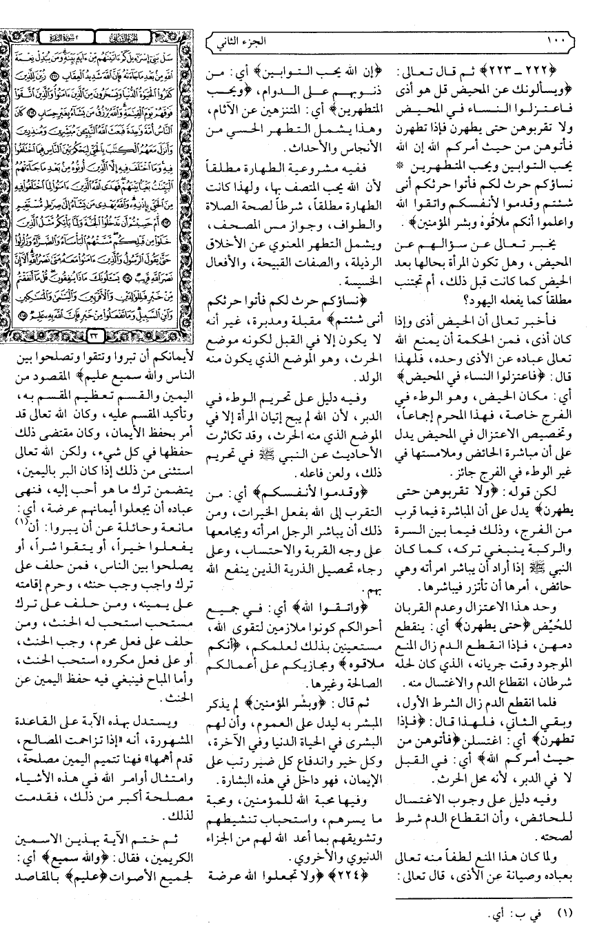 {222 - 223} {وَيَسْأَلُونَكَ عَنِ الْمَحِيضِ قُلْ هُوَ أَذًى فَاعْتَزِلُوا النِّسَاءَ فِي الْمَحِيضِ وَلا تَقْرَبُوهُنَّ حَتَّى يَطْهُرْنَ فَإِذَا تَطَهَّرْنَ فَأْتُوهُنَّ مِنْ حَيْثُ أَمَرَكُمُ اللَّهُ إِنَّ اللَّهَ يُحِبُّ التَّوَّابِينَ وَيُحِبُّ الْمُتَطَهِّرِينَ * نِسَاؤُكُمْ حَرْثٌ لَكُمْ فَأْتُوا حَرْثَكُمْ أَنَّى شِئْتُمْ وَقَدِّمُوا لأنْفُسِكُمْ وَاتَّقُوا اللَّهَ وَاعْلَمُوا أَنَّكُمْ مُلاقُوهُ وَبَشِّرِ الْمُؤْمِنِينَ} .