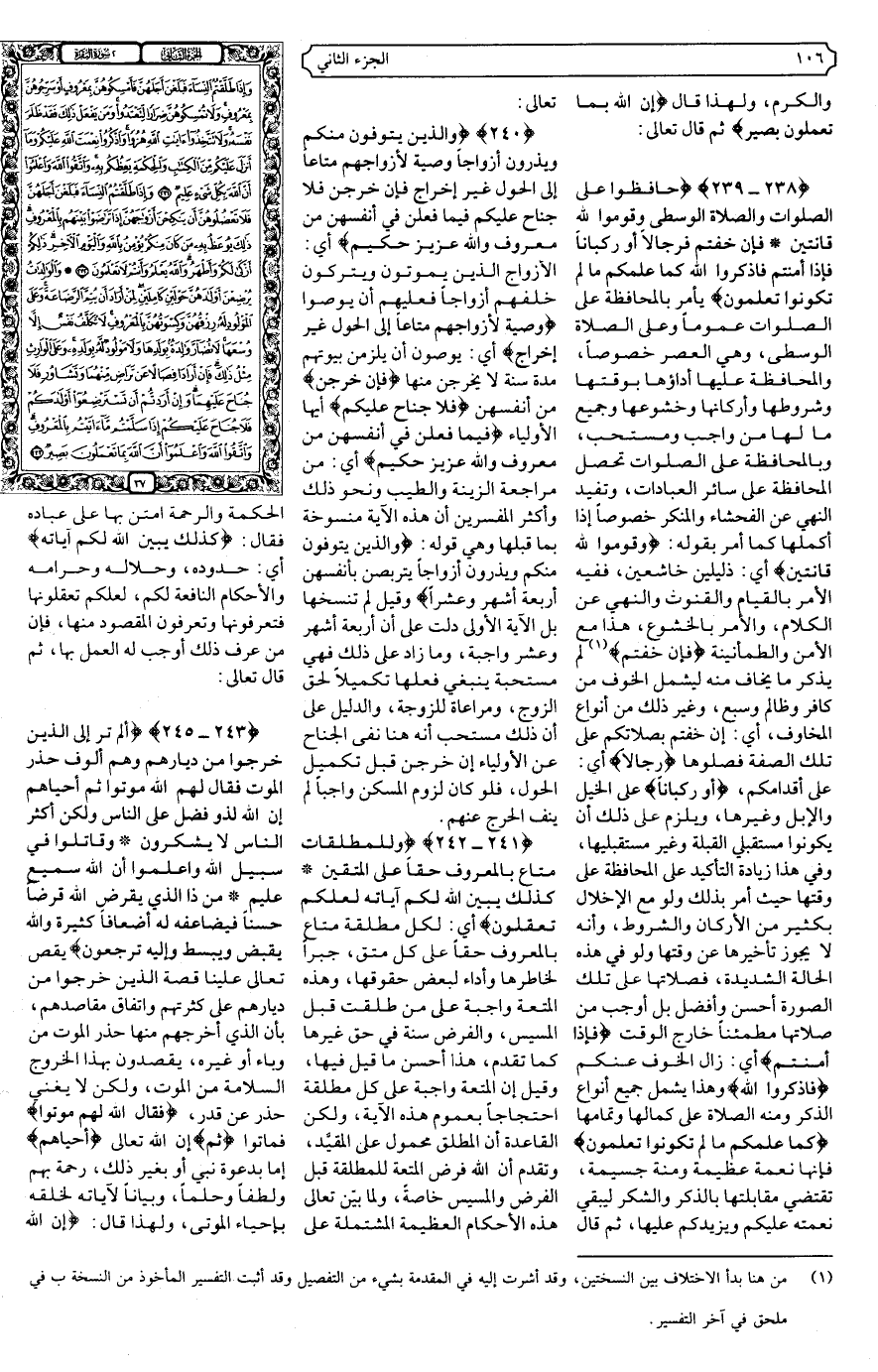 {240} {وَالَّذِينَ يُتَوَفَّوْنَ مِنْكُمْ وَيَذَرُونَ أَزْوَاجًا وَصِيَّةً لأزْوَاجِهِمْ مَتَاعًا إِلَى الْحَوْلِ غَيْرَ إِخْرَاجٍ فَإِنْ خَرَجْنَ فَلا جُنَاحَ عَلَيْكُمْ فِي مَا فَعَلْنَ فِي أَنْفُسِهِنَّ مِنْ مَعْرُوفٍ وَاللَّهُ عَزِيزٌ حَكِيمٌ} .