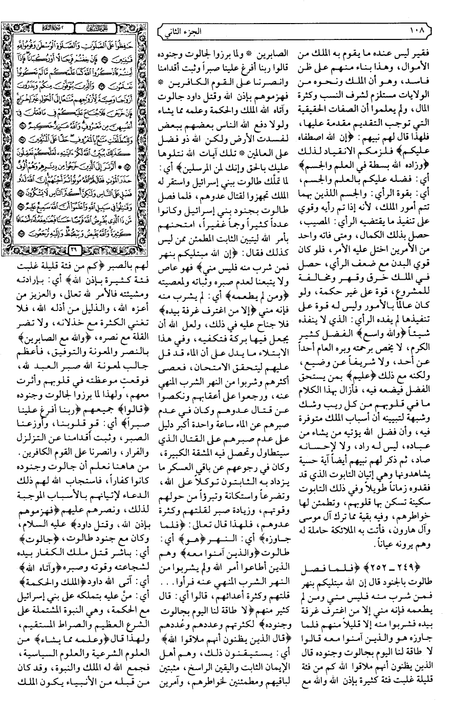 {249-252} {فَلَمَّا فَصَلَ طَالُوتُ بِالْجُنُودِ قَالَ إِنَّ اللَّهَ مُبْتَلِيكُمْ بِنَهَرٍ فَمَنْ شَرِبَ مِنْهُ فَلَيْسَ مِنِّي وَمَنْ لَمْ يَطْعَمْهُ فَإِنَّهُ مِنِّي إِلا مَنِ اغْتَرَفَ غُرْفَةً بِيَدِهِ فَشَرِبُوا مِنْهُ إِلا قَلِيلا مِنْهُمْ فَلَمَّا جَاوَزَهُ هُوَ وَالَّذِينَ آمَنُوا مَعَهُ قَالُوا لا طَاقَةَ لَنَا الْيَوْمَ بِجَالُوتَ وَجُنُودِهِ قَالَ الَّذِينَ يَظُنُّونَ أَنَّهُمْ مُلاقُو اللَّهِ كَمْ مِنْ فِئَةٍ قَلِيلَةٍ غَلَبَتْ فِئَةً كَثِيرَةً بِإِذْنِ اللَّهِ وَاللَّهُ مَعَ الصَّابِرِينَ * وَلَمَّا بَرَزُوا لِجَالُوتَ وَجُنُودِهِ قَالُوا رَبَّنَا أَفْرِغْ عَلَيْنَا صَبْرًا وَثَبِّتْ أَقْدَامَنَا وَانْصُرْنَا عَلَى الْقَوْمِ الْكَافِرِينَ * فَهَزَمُوهُمْ بِإِذْنِ اللَّهِ وَقَتَلَ دَاوُدُ جَالُوتَ وَآتَاهُ اللَّهُ الْمُلْكَ وَالْحِكْمَةَ وَعَلَّمَهُ مِمَّا يَشَاءُ وَلَوْلا دَفْعُ اللَّهِ النَّاسَ بَعْضَهُمْ بِبَعْضٍ لَفَسَدَتِ الأرْضُ وَلَكِنَّ اللَّهَ ذُو فَضْلٍ عَلَى الْعَالَمِينَ * تِلْكَ آيَاتُ اللَّهِ نَتْلُوهَا عَلَيْكَ بِالْحَقِّ وَإِنَّكَ لَمِنَ الْمُرْسَلِينَ} .