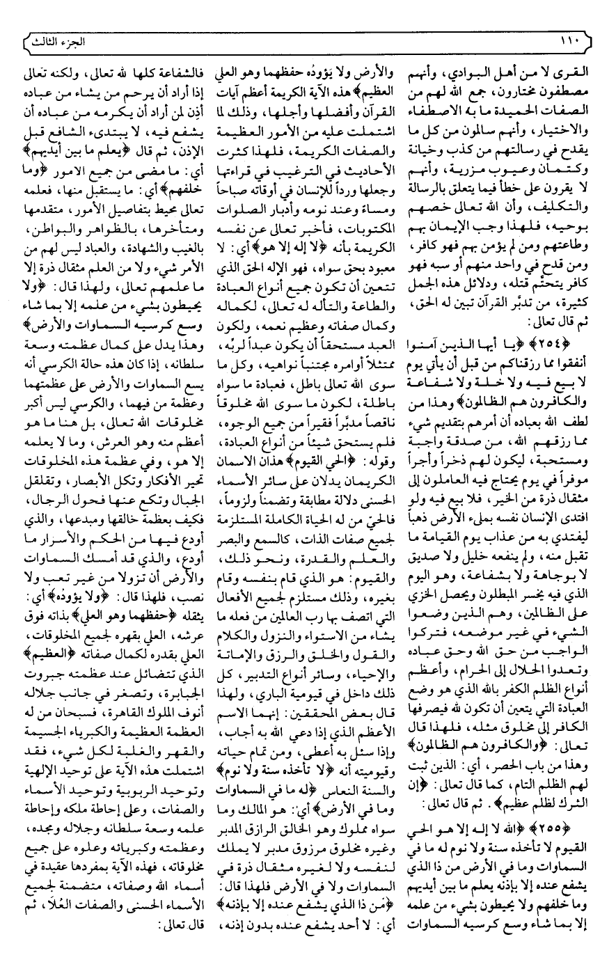 {255} {اللَّهُ لا إِلَهَ إِلا هُوَ الْحَيُّ الْقَيُّومُ لا تَأْخُذُهُ سِنَةٌ وَلا نَوْمٌ لَهُ مَا فِي السَّمَاوَاتِ وَمَا فِي الأرْضِ مَنْ ذَا الَّذِي يَشْفَعُ عِنْدَهُ إِلا بِإِذْنِهِ يَعْلَمُ مَا بَيْنَ أَيْدِيهِمْ وَمَا خَلْفَهُمْ وَلا يُحِيطُونَ بِشَيْءٍ مِنْ عِلْمِهِ إِلا بِمَا شَاءَ وَسِعَ كُرْسِيُّهُ السَّمَاوَاتِ وَالأرْضَ وَلا يَئُودُهُ حِفْظُهُمَا وَهُوَ الْعَلِيُّ الْعَظِيمُ} .