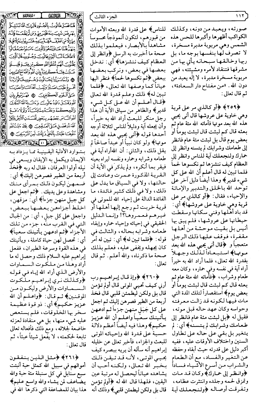 {259} {أَوْ كَالَّذِي مَرَّ عَلَى قَرْيَةٍ وَهِيَ خَاوِيَةٌ عَلَى عُرُوشِهَا قَالَ أَنَّى يُحْيِي هَذِهِ اللَّهُ بَعْدَ مَوْتِهَا فَأَمَاتَهُ اللَّهُ مِائَةَ عَامٍ ثُمَّ بَعَثَهُ قَالَ كَمْ لَبِثْتَ قَالَ لَبِثْتُ يَوْمًا أَوْ بَعْضَ يَوْمٍ قَالَ بَلْ لَبِثْتَ مِائَةَ عَامٍ فَانْظُرْ إِلَى طَعَامِكَ وَشَرَابِكَ لَمْ يَتَسَنَّهْ وَانْظُرْ إِلَى حِمَارِكَ وَلِنَجْعَلَكَ آيَةً لِلنَّاسِ وَانْظُرْ إِلَى الْعِظَامِ كَيْفَ نُنْشِزُهَا ثُمَّ نَكْسُوهَا لَحْمًا فَلَمَّا تَبَيَّنَ لَهُ قَالَ أَعْلَمُ أَنَّ اللَّهَ عَلَى كُلِّ شَيْءٍ قَدِيرٌ} .