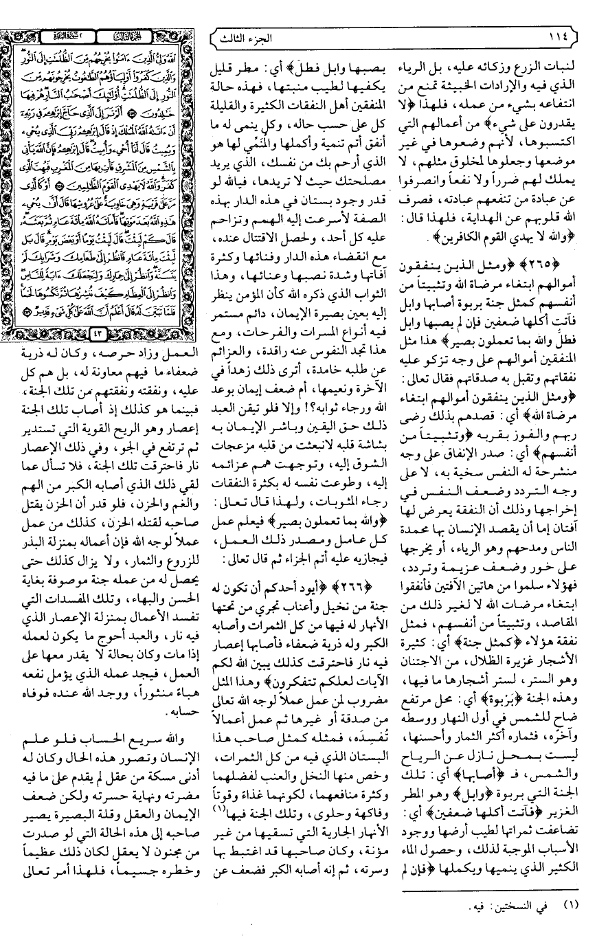 {266} {أَيَوَدُّ أَحَدُكُمْ أَنْ تَكُونَ لَهُ جَنَّةٌ مِنْ نَخِيلٍ وَأَعْنَابٍ تَجْرِي مِنْ تَحْتِهَا الأنْهَارُ لَهُ فِيهَا مِنْ كُلِّ الثَّمَرَاتِ وَأَصَابَهُ الْكِبَرُ وَلَهُ ذُرِّيَّةٌ ضُعَفَاءُ فَأَصَابَهَا إِعْصَارٌ فِيهِ نَارٌ فَاحْتَرَقَتْ كَذَلِكَ يُبَيِّنُ اللَّهُ لَكُمُ الآيَاتِ لَعَلَّكُمْ تَتَفَكَّرُونَ} .