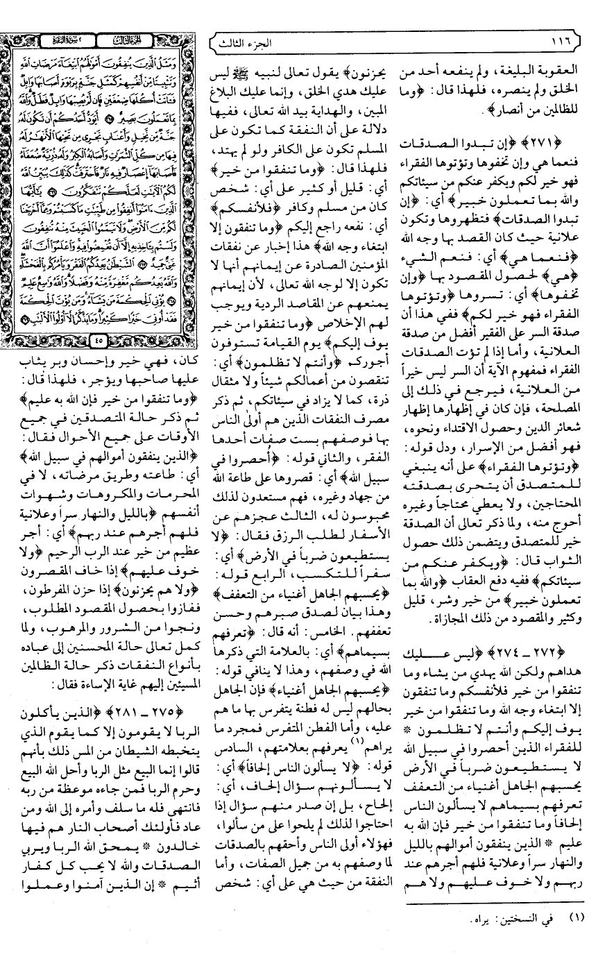 {275 - 281} {الَّذِينَ يَأْكُلُونَ الرِّبَا لا يَقُومُونَ إِلا كَمَا يَقُومُ الَّذِي يَتَخَبَّطُهُ الشَّيْطَانُ مِنَ الْمَسِّ ذَلِكَ بِأَنَّهُمْ قَالُوا إِنَّمَا الْبَيْعُ مِثْلُ الرِّبَا وَأَحَلَّ اللَّهُ الْبَيْعَ وَحَرَّمَ الرِّبَا فَمَنْ جَاءَهُ مَوْعِظَةٌ مِنْ رَبِّهِ فَانْتَهَى فَلَهُ مَا سَلَفَ وَأَمْرُهُ إِلَى اللَّهِ وَمَنْ عَادَ فَأُولَئِكَ أَصْحَابُ النَّارِ هُمْ فِيهَا خَالِدُونَ * يَمْحَقُ اللَّهُ الرِّبَا وَيُرْبِي الصَّدَقَاتِ وَاللَّهُ لا يُحِبُّ كُلَّ كَفَّارٍ أَثِيمٍ * إِنَّ الَّذِينَ آمَنُوا وَعَمِلُوا -[117]- الصَّالِحَاتِ وَأَقَامُوا الصَّلاةَ وَآتَوُا الزَّكَاةَ لَهُمْ أَجْرُهُمْ عِنْدَ رَبِّهِمْ وَلا خَوْفٌ عَلَيْهِمْ وَلا هُمْ يَحْزَنُونَ * يَا أَيُّهَا الَّذِينَ آمَنُوا اتَّقُوا اللَّهَ وَذَرُوا مَا بَقِيَ مِنَ الرِّبَا إِنْ كُنْتُمْ مُؤْمِنِينَ * فَإِنْ لَمْ تَفْعَلُوا فَأْذَنُوا بِحَرْبٍ مِنَ اللَّهِ وَرَسُولِهِ وَإِنْ تُبْتُمْ فَلَكُمْ رُءُوسُ أَمْوَالِكُمْ لا تَظْلِمُونَ وَلا تُظْلَمُونَ * وَإِنْ كَانَ ذُو عُسْرَةٍ فَنَظِرَةٌ إِلَى مَيْسَرَةٍ وَأَنْ تَصَدَّقُوا خَيْرٌ لَكُمْ إِنْ كُنْتُمْ تَعْلَمُونَ * وَاتَّقُوا يَوْمًا تُرْجَعُونَ فِيهِ إِلَى اللَّهِ ثُمَّ تُوَفَّى كُلُّ نَفْسٍ مَا كَسَبَتْ وَهُمْ لا يُظْلَمُونَ} .