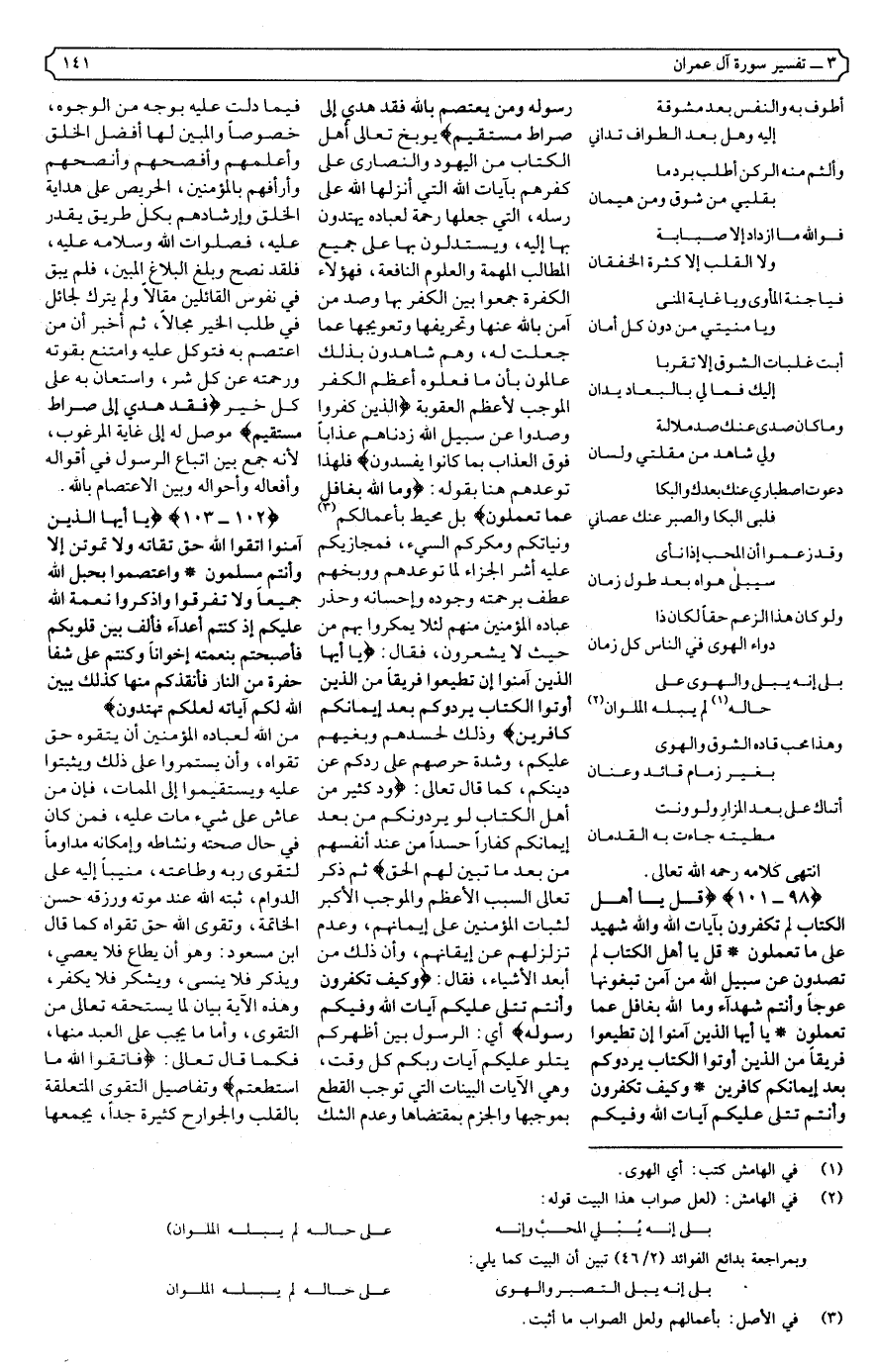 {102 - 103} {يَا أَيُّهَا الَّذِينَ آمَنُوا اتَّقُوا اللَّهَ حَقَّ تُقَاتِهِ وَلا تَمُوتُنَّ إِلا وَأَنْتُمْ مُسْلِمُونَ * وَاعْتَصِمُوا بِحَبْلِ اللَّهِ جَمِيعًا وَلا تَفَرَّقُوا وَاذْكُرُوا نِعْمَةَ اللَّهِ عَلَيْكُمْ إِذْ كُنْتُمْ أَعْدَاءً فَأَلَّفَ بَيْنَ قُلُوبِكُمْ فَأَصْبَحْتُمْ بِنِعْمَتِهِ إِخْوَانًا وَكُنْتُمْ عَلَى شَفَا حُفْرَةٍ مِنَ النَّارِ فَأَنْقَذَكُمْ مِنْهَا كَذَلِكَ يُبَيِّنُ اللَّهُ لَكُمْ آيَاتِهِ لَعَلَّكُمْ تَهْتَدُونَ} .