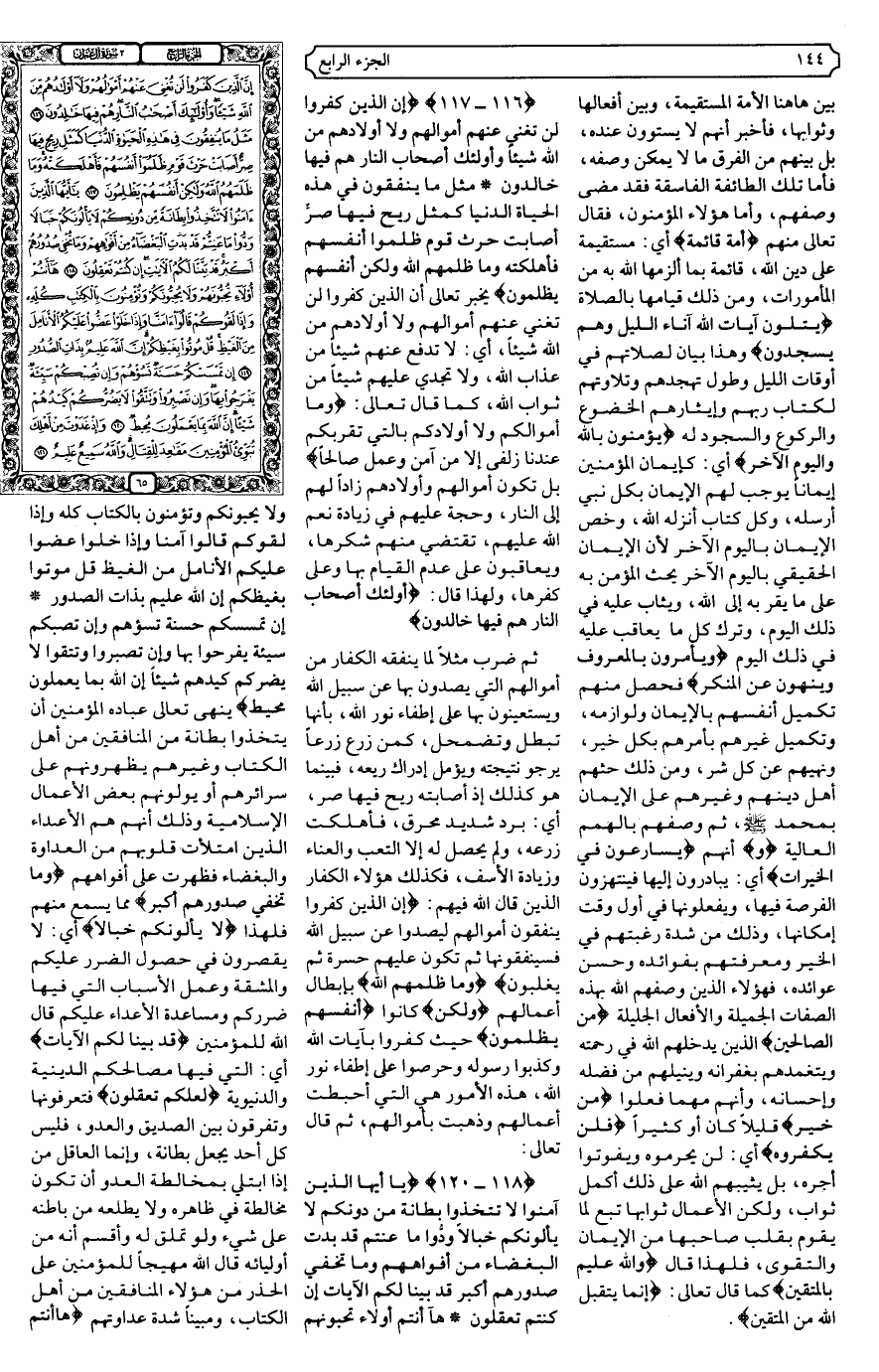 {118 - 120} {يَا أَيُّهَا الَّذِينَ آمَنُوا لا تَتَّخِذُوا بِطَانَةً مِنْ دُونِكُمْ لا يَأْلُونَكُمْ خَبَالا وَدُّوا مَا عَنِتُّمْ قَدْ بَدَتِ الْبَغْضَاءُ مِنْ أَفْوَاهِهِمْ وَمَا تُخْفِي صُدُورُهُمْ أَكْبَرُ قَدْ بَيَّنَّا لَكُمُ الآيَاتِ إِنْ كُنْتُمْ تَعْقِلُونَ * هَا أَنْتُمْ أُولاءِ تُحِبُّونَهُمْ وَلا يُحِبُّونَكُمْ وَتُؤْمِنُونَ بِالْكِتَابِ كُلِّهِ وَإِذَا لَقُوكُمْ قَالُوا آمَنَّا وَإِذَا خَلَوْا عَضُّوا عَلَيْكُمُ الأنَامِلَ مِنَ الْغَيْظِ قُلْ مُوتُوا بِغَيْظِكُمْ إِنَّ اللَّهَ عَلِيمٌ بِذَاتِ الصُّدُورِ * إِنْ تَمْسَسْكُمْ حَسَنَةٌ تَسُؤْهُمْ وَإِنْ تُصِبْكُمْ سَيِّئَةٌ يَفْرَحُوا بِهَا وَإِنْ تَصْبِرُوا وَتَتَّقُوا لا يَضُرُّكُمْ كَيْدُهُمْ شَيْئًا إِنَّ اللَّهَ بِمَا يَعْمَلُونَ مُحِيطٌ} .