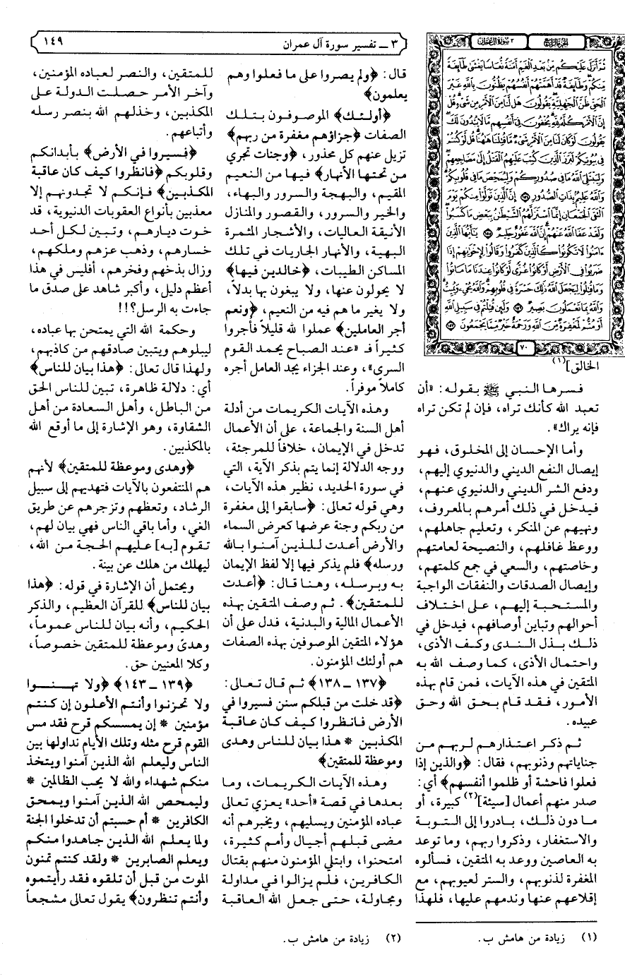 ثم قال تعالى: {137 - 138} {قَدْ خَلَتْ مِنْ قَبْلِكُمْ سُنَنٌ فَسِيرُوا فِي الأرْضِ فَانْظُروا كَيْفَ كَانَ عَاقِبَةُ الْمُكَذِّبِينَ * هَذَا بَيَانٌ لِلنَّاسِ وَهُدًى وَمَوْعِظَةٌ لِلْمُتَّقِينَ} .