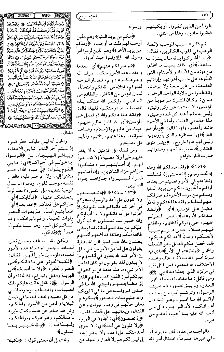 {152} {وَلَقَدْ صَدَقَكُمُ اللَّهُ وَعْدَهُ إِذْ تَحُسُّونَهُمْ بِإِذْنِهِ حَتَّى إِذَا فَشِلْتُمْ وَتَنَازَعْتُمْ فِي الأمْرِ وَعَصَيْتُمْ مِنْ بَعْدِ مَا أَرَاكُمْ مَا تُحِبُّونَ مِنْكُمْ مَنْ يُرِيدُ الدُّنْيَا وَمِنْكُمْ مَنْ يُرِيدُ الآخِرَةَ ثُمَّ صَرَفَكُمْ عَنْهُمْ لِيَبْتَلِيَكُمْ وَلَقَدْ عَفَا عَنْكُمْ وَاللَّهُ ذُو فَضْلٍ عَلَى الْمُؤْمِنِينَ} .