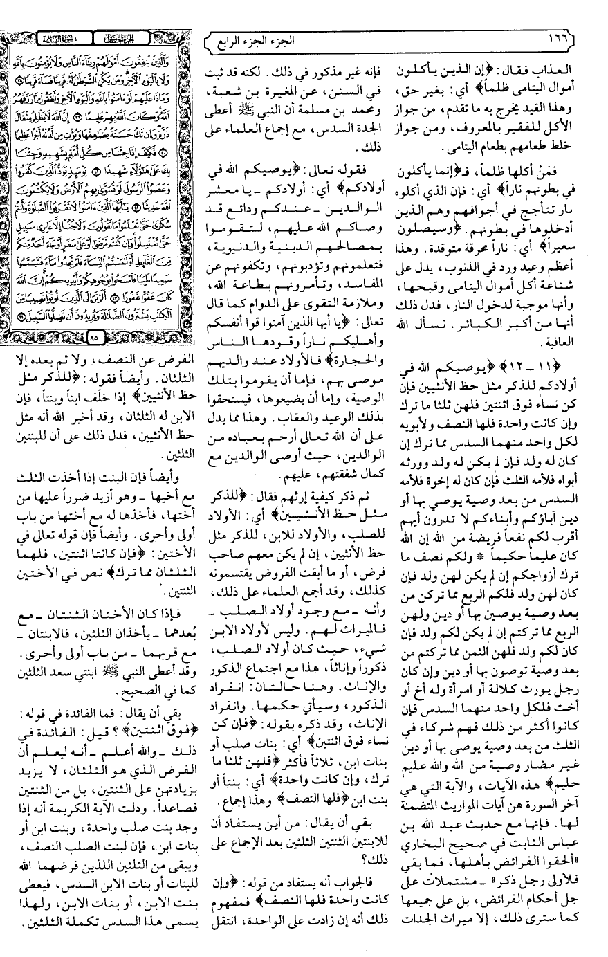 {11، 12} {يُوصِيكُمُ اللَّهُ فِي أَوْلادِكُمْ لِلذَّكَرِ مِثْلُ حَظِّ الأنْثَيَيْنِ فَإِنْ كُنَّ نِسَاءً فَوْقَ اثْنَتَيْنِ فَلَهُنَّ ثُلُثَا مَا تَرَكَ وَإِنْ كَانَتْ وَاحِدَةً فَلَهَا النِّصْفُ وَلأبَوَيْهِ لِكُلِّ وَاحِدٍ مِنْهُمَا السُّدُسُ مِمَّا تَرَكَ إِنْ كَانَ لَهُ وَلَدٌ فَإِنْ لَمْ يَكُنْ لَهُ وَلَدٌ وَوَرِثَهُ أَبَوَاهُ فَلأمِّهِ الثُّلُثُ فَإِنْ كَانَ لَهُ إِخْوَةٌ فَلأمِّهِ السُّدُسُ مِنْ بَعْدِ وَصِيَّةٍ يُوصِي بِهَا أَوْ دَيْنٍ آبَاؤُكُمْ وَأَبْنَاؤُكُمْ لا تَدْرُونَ أَيُّهُمْ أَقْرَبُ لَكُمْ نَفْعًا فَرِيضَةً مِنَ اللَّهِ إِنَّ اللَّهَ كَانَ عَلِيمًا حَكِيمًا} .