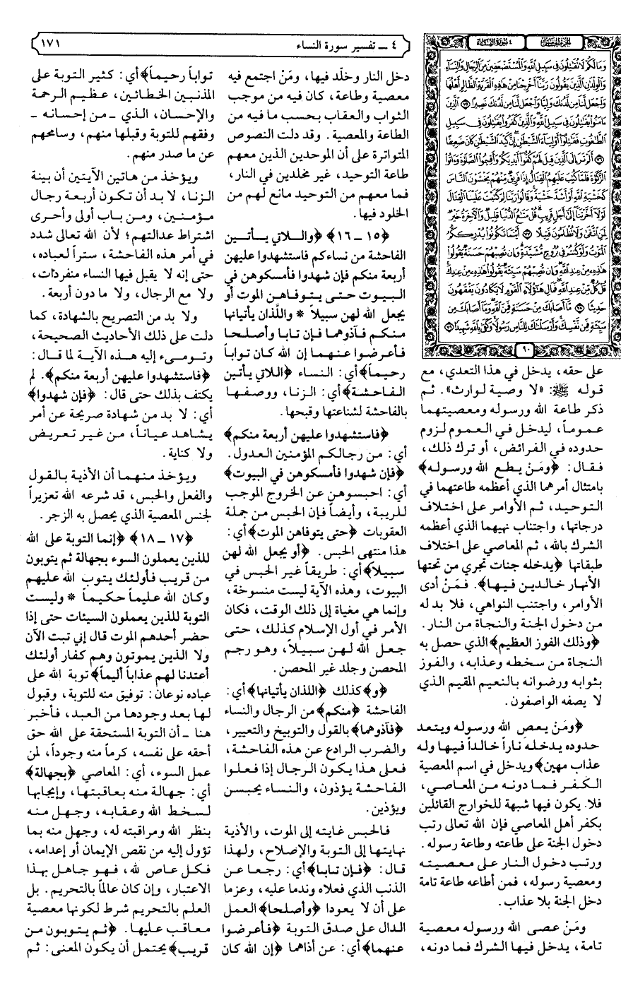 {15، 16} {وَاللاتِي يَأْتِينَ الْفَاحِشَةَ مِنْ نِسَائِكُمْ فَاسْتَشْهِدُوا عَلَيْهِنَّ أَرْبَعَةً مِنْكُمْ فَإِنْ شَهِدُوا فَأَمْسِكُوهُنَّ فِي الْبُيُوتِ حَتَّى يَتَوَفَّاهُنَّ الْمَوْتُ أَوْ يَجْعَلَ اللَّهُ لَهُنَّ سَبِيلا * وَاللَّذَانِ يَأْتِيَانِهَا مِنْكُمْ فَآذُوهُمَا فَإِنْ تَابَا وَأَصْلَحَا فَأَعْرِضُوا عَنْهُمَا إِنَّ اللَّهَ كَانَ تَوَّابًا رَحِيمًا} .