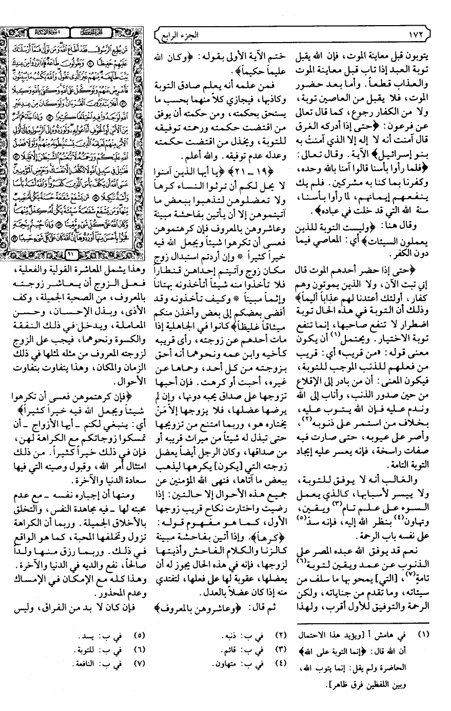 {19 - 21} {يَا أَيُّهَا الَّذِينَ آمَنُوا لا يَحِلُّ لَكُمْ أَنْ تَرِثُوا النِّسَاءَ كَرْهًا وَلا تَعْضُلُوهُنَّ لِتَذْهَبُوا بِبَعْضِ مَا آتَيْتُمُوهُنَّ إِلا أَنْ يَأْتِينَ بِفَاحِشَةٍ مُبَيِّنَةٍ وَعَاشِرُوهُنَّ بِالْمَعْرُوفِ فَإِنْ كَرِهْتُمُوهُنَّ فَعَسَى أَنْ تَكْرَهُوا شَيْئًا وَيَجْعَلَ اللَّهُ فِيهِ خَيْرًا كَثِيرًا} .
