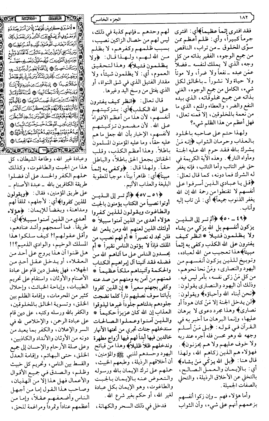 فدخل في ذلك السحر والكهانة، وعبادة غير الله، وطاعة الشيطان، كل هذا من الجبت والطاغوت، وكذلك حَمَلهم الكفر والحسد على أن فضلوا طريقة الكافرين بالله -عبدة الأصنام- على طريق المؤمنين فقال: {وَيَقُولُونَ لِلَّذِينَ كَفَرُوا} أي: لأجلهم تملقا لهم ومداهنة، وبغضا للإيمان: {هَؤُلاءِ أَهْدَى مِنَ الَّذِينَ آمَنُوا سَبِيلا} أي: طريقا. فما أسمجهم وأشد عنادهم وأقل عقولهم! كيف سلكوا هذا المسلك الوخيم والوادي الذميم؟. هل ظنوا أن هذا يروج على أحد من العقلاء، أو يدخل عقلَ أحد من الجهلاء، فهل يُفَضَّل دين قام على عبادة الأصنام والأوثان، واستقام على تحريم الطيبات، وإباحة الخبائث، وإحلال كثير من المحرمات، وإقامة الظلم بين الخلق، وتسوية الخالق بالمخلوقين، والكفر بالله ورسله وكتبه، على دين قام على عبادة الرحمن، والإخلاص لله في السر والإعلان، والكفر بما يعبد من دونه من الأوثان والأنداد والكاذبين، وعلى صلة الأرحام والإحسان إلى جميع الخلق، حتى البهائم، وإقامة العدل والقسط بين الناس، وتحريم كل خبيث وظلم، والصدق في جميع الأقوال والأعمال، فهل هذا إلا من الهذيان، وصاحب هذا القول إما من أجهل الناس وأضعفهم عقلا وإما من أعظمهم عنادا وتمردا ومراغمة للحق، -[183]- وهذا هو الواقع، ولهذا قال تعالى عنهم: {أُولَئِكَ الَّذِينَ لَعَنَهُمُ اللَّهُ} أي: طردهم عن رحمته وأحل عليهم نقمته. {وَمَنْ يَلْعَنِ اللَّهُ فَلَنْ تَجِدَ لَهُ نَصِيرًا} أي: يتولاه ويقوم بمصالحه ويحفظه عن المكاره، وهذا غاية الخذلان.