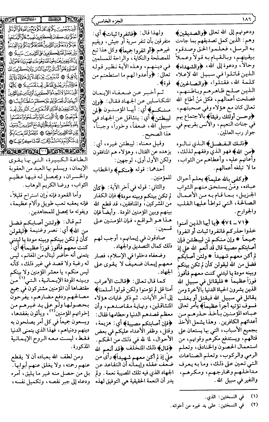 {71 - 74} {يَا أَيُّهَا الَّذِينَ آمَنُوا خُذُوا حِذْرَكُمْ فَانْفِرُوا ثُبَاتٍ أَوِ انْفِرُوا جَمِيعًا * وَإِنَّ مِنْكُمْ لَمَنْ لَيُبَطِّئَنَّ فَإِنْ أَصَابَتْكُمْ مُصِيبَةٌ قَالَ قَدْ أَنْعَمَ اللَّهُ عَلَيَّ إِذْ لَمْ أَكُنْ مَعَهُمْ شَهِيدًا * وَلَئِنْ أَصَابَكُمْ فَضْلٌ مِنَ اللَّهِ لَيَقُولَنَّ كَأَنْ لَمْ تَكُنْ بَيْنَكُمْ وَبَيْنَهُ مَوَدَّةٌ يَا لَيْتَنِي كُنْتُ مَعَهُمْ فَأَفُوزَ فَوْزًا عَظِيمًا * فَلْيُقَاتِلْ فِي سَبِيلِ اللَّهِ الَّذِينَ يَشْرُونَ الْحَيَاةَ الدُّنْيَا بِالآخِرَةِ وَمَنْ يُقَاتِلْ فِي سَبِيلِ اللَّهِ فَيُقْتَلْ أَوْ يَغْلِبْ فَسَوْفَ نُؤْتِيهِ أَجْرًا عَظِيمًا} .