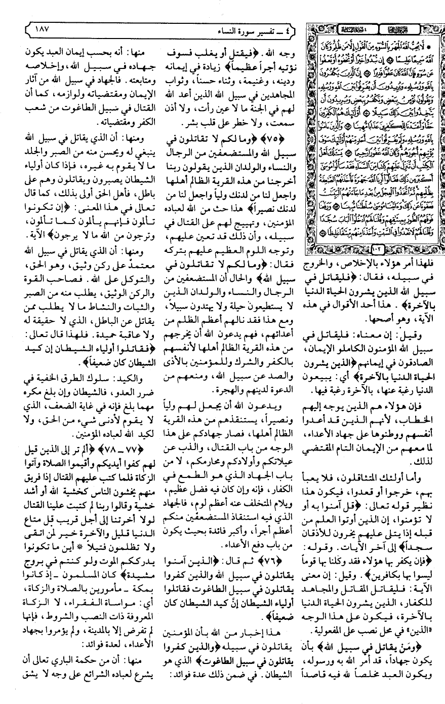 {76} .ثم قال: {الَّذِينَ آمَنُوا يُقَاتِلُونَ فِي سَبِيلِ اللَّهِ وَالَّذِينَ كَفَرُوا يُقَاتِلُونَ فِي سَبِيلِ الطَّاغُوتِ فَقَاتِلُوا أَوْلِيَاءَ الشَّيْطَانِ إِنَّ كَيْدَ الشَّيْطَانِ كَانَ ضَعِيفًا} .