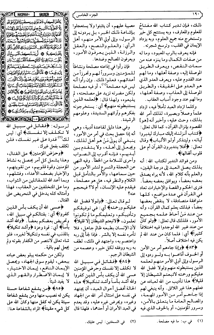 {84} {فَقَاتِلْ فِي سَبِيلِ اللَّهِ لا تُكَلَّفُ إِلا نَفْسَكَ وَحَرِّضِ الْمُؤْمِنِينَ عَسَى اللَّهُ أَنْ يَكُفَّ بَأْسَ الَّذِينَ كَفَرُوا وَاللَّهُ أَشَدُّ بَأْسًا وَأَشَدُّ تَنْكِيلا} .