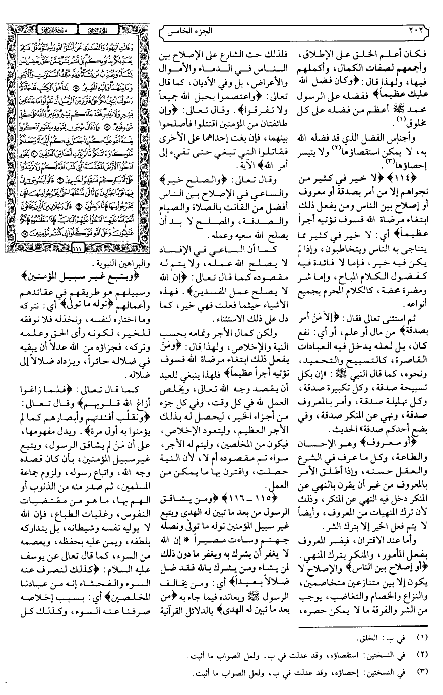{أَوْ إِصْلاحٍ بَيْنَ النَّاسِ} والإصلاح لا يكون إلا بين متنازعين متخاصمين، والنزاع والخصام والتغاضب يوجب من الشر والفرقة ما لا يمكن حصره، فلذلك حث الشارع على الإصلاح بين الناس في الدماء والأموال والأعراض، بل وفي الأديان كما قال تعالى: {وَاعْتَصِمُوا بِحَبْلِ اللَّهِ جَمِيعًا وَلا تَفَرَّقُوا} وقال تعالى: {وَإِنْ طَائِفَتَانِ مِنَ الْمُؤْمِنِينَ اقْتَتَلُوا فَأَصْلِحُوا بَيْنَهُمَا فَإِنْ بَغَتْ إِحْدَاهُمَا عَلَى الأخْرَى فَقَاتِلُوا الَّتِي تَبْغِي حَتَّى تَفِيءَ إِلَى أَمْرِ اللَّهِ} الآية.