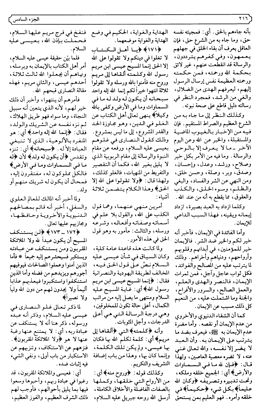 {171} {يَا أَهْلَ الْكِتَابِ لا تَغْلُوا فِي دِينِكُمْ وَلا تَقُولُوا عَلَى اللَّهِ إِلا الْحَقَّ إِنَّمَا الْمَسِيحُ عِيسَى ابْنُ مَرْيَمَ رَسُولُ اللَّهِ وَكَلِمَتُهُ أَلْقَاهَا إِلَى مَرْيَمَ وَرُوحٌ مِنْهُ فَآمِنُوا بِاللَّهِ وَرُسُلِهِ وَلا تَقُولُوا ثَلاثَةٌ انْتَهُوا خَيْرًا لَكُمْ إِنَّمَا اللَّهُ إِلَهٌ وَاحِدٌ سُبْحَانَهُ أَنْ يَكُونَ لَهُ وَلَدٌ لَهُ مَا فِي السَّمَاوَاتِ وَمَا فِي الأرْضِ وَكَفَى بِاللَّهِ وَكِيلا} .
