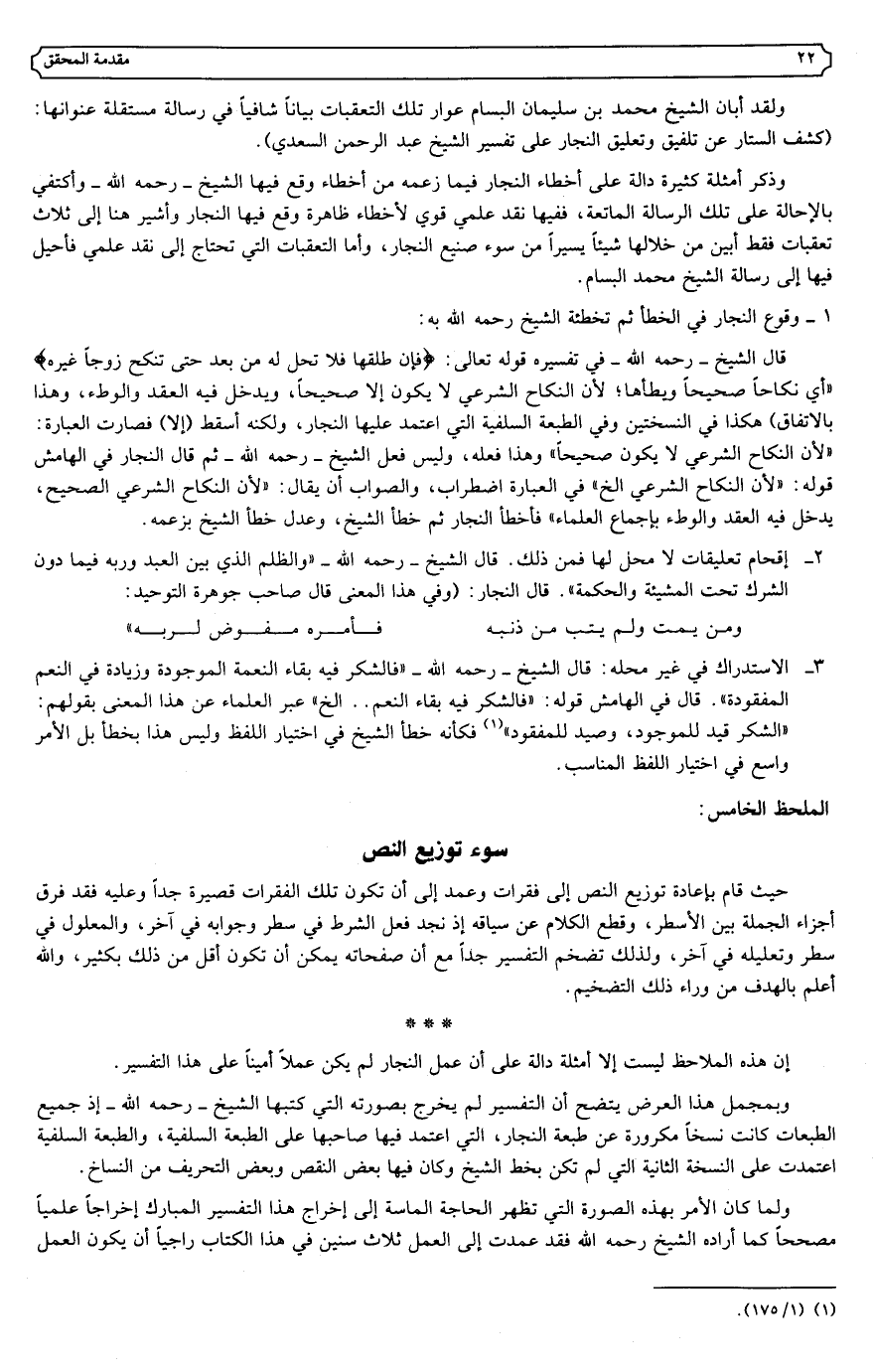 قال الشيخ -رحمه الله- في تفسيره قوله تعالى: {فَإِنْ طَلَّقَهَا فَلا تَحِلُّ لَهُ مِنْ بَعْدُ حَتَّى تَنْكِحَ زَوْجًا غَيْرَهُ} "أي نكاحا صحيحا ويطأها؛ لأن النكاح الشرعي لا يكون إلا صحيحا، ويدخل فيه العقد والوطء، وهذا بالاتفاق) هكذا في النسختين وفي الطبعة السلفية التي اعتمد عليها النجار، ولكنه أسقط (إلا) فصارت العبارة: "لأن النكاح الشرعي لا يكون صحيحا" وهذا فعله، وليس فعل الشيخ -رحمه الله- ثم قال النجار في الهامش قوله: "لأن النكاح الشرعي إلخ" في العبارة اضطراب، والصواب أن يقال: "لأن النكاح الشرعي الصحيح، يدخل فيه العقد والوطء بإجماع العلماء" فأخطأ النجار ثم خطأ الشيخ، وعدل خطأ الشيخ بزعمه.