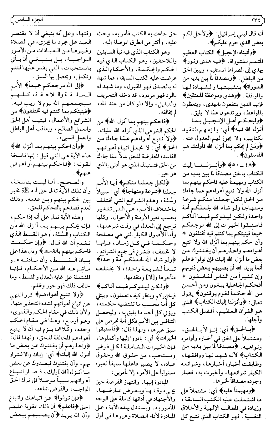 {48 - 50} {وَأَنْزَلْنَا إِلَيْكَ الْكِتَابَ بِالْحَقِّ مُصَدِّقًا لِمَا بَيْنَ يَدَيْهِ مِنَ الْكِتَابِ وَمُهَيْمِنًا عَلَيْهِ فَاحْكُمْ بَيْنَهُمْ بِمَا أَنْزَلَ اللَّهُ وَلا تَتَّبِعْ أَهْوَاءَهُمْ عَمَّا جَاءَكَ مِنَ الْحَقِّ لِكُلٍّ جَعَلْنَا مِنْكُمْ شِرْعَةً وَمِنْهَاجًا وَلَوْ شَاءَ اللَّهُ لَجَعَلَكُمْ أُمَّةً وَاحِدَةً وَلَكِنْ لِيَبْلُوَكُمْ فِي مَا آتَاكُمْ فَاسْتَبِقُوا الْخَيْرَاتِ إِلَى اللَّهِ مَرْجِعُكُمْ جَمِيعًا فَيُنَبِّئُكُمْ بِمَا كُنْتُمْ فِيهِ تَخْتَلِفُونَ * وَأَنِ احْكُمْ بَيْنَهُمْ بِمَا أَنْزَلَ اللَّهُ وَلا تَتَّبِعْ أَهْوَاءَهُمْ وَاحْذَرْهُمْ أَنْ يَفْتِنُوكَ عَنْ بَعْضِ مَا أَنْزَلَ اللَّهُ إِلَيْكَ فَإِنْ تَوَلَّوْا فَاعْلَمْ أَنَّمَا يُرِيدُ اللَّهُ أَنْ يُصِيبَهُمْ بِبَعْضِ ذُنُوبِهِمْ وَإِنَّ كَثِيرًا مِنَ النَّاسِ لَفَاسِقُونَ * أَفَحُكْمَ الْجَاهِلِيَّةِ يَبْغُونَ وَمَنْ أَحْسَنُ مِنَ اللَّهِ حُكْمًا لِقَوْمٍ يُوقِنُونَ} .