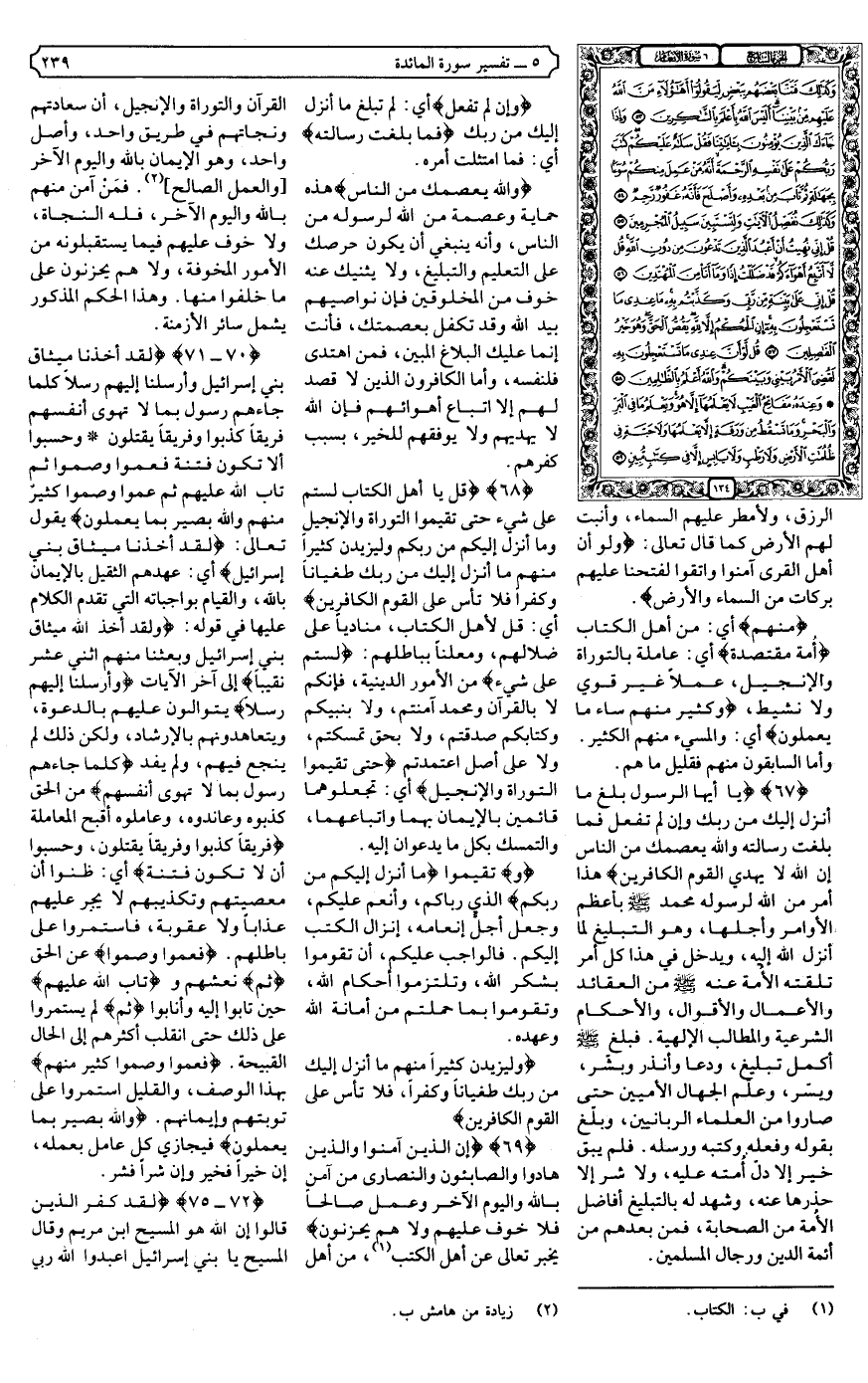 {72 - 75} {لَقَدْ كَفَرَ الَّذِينَ قَالُوا إِنَّ اللَّهَ هُوَ الْمَسِيحُ ابْنُ مَرْيَمَ وَقَالَ الْمَسِيحُ يَا بَنِي إِسْرَائِيلَ اعْبُدُوا اللَّهَ رَبِّي -[240]- وَرَبَّكُمْ إِنَّهُ مَنْ يُشْرِكْ بِاللَّهِ فَقَدْ حَرَّمَ اللَّهُ عَلَيْهِ الْجَنَّةَ وَمَأْوَاهُ النَّارُ وَمَا لِلظَّالِمِينَ مِنْ أَنْصَارٍ * لَقَدْ كَفَرَ الَّذِينَ قَالُوا إِنَّ اللَّهَ ثَالِثُ ثَلاثَةٍ وَمَا مِنْ إِلَهٍ إِلا إِلَهٌ وَاحِدٌ وَإِنْ لَمْ يَنْتَهُوا عَمَّا يَقُولُونَ لَيَمَسَّنَّ الَّذِينَ كَفَرُوا مِنْهُمْ عَذَابٌ أَلِيمٌ * أَفَلا يَتُوبُونَ إِلَى اللَّهِ وَيَسْتَغْفِرُونَهُ وَاللَّهُ غَفُورٌ رَحِيمٌ * مَا الْمَسِيحُ ابْنُ مَرْيَمَ إِلا رَسُولٌ قَدْ خَلَتْ مِنْ قَبْلِهِ الرُّسُلُ وَأُمُّهُ صِدِّيقَةٌ كَانَا يَأْكُلانِ الطَّعَامَ انْظُرْ كَيْفَ نُبَيِّنُ لَهُمُ الآيَاتِ ثُمَّ انْظُرْ أَنَّى يُؤْفَكُونَ} .
