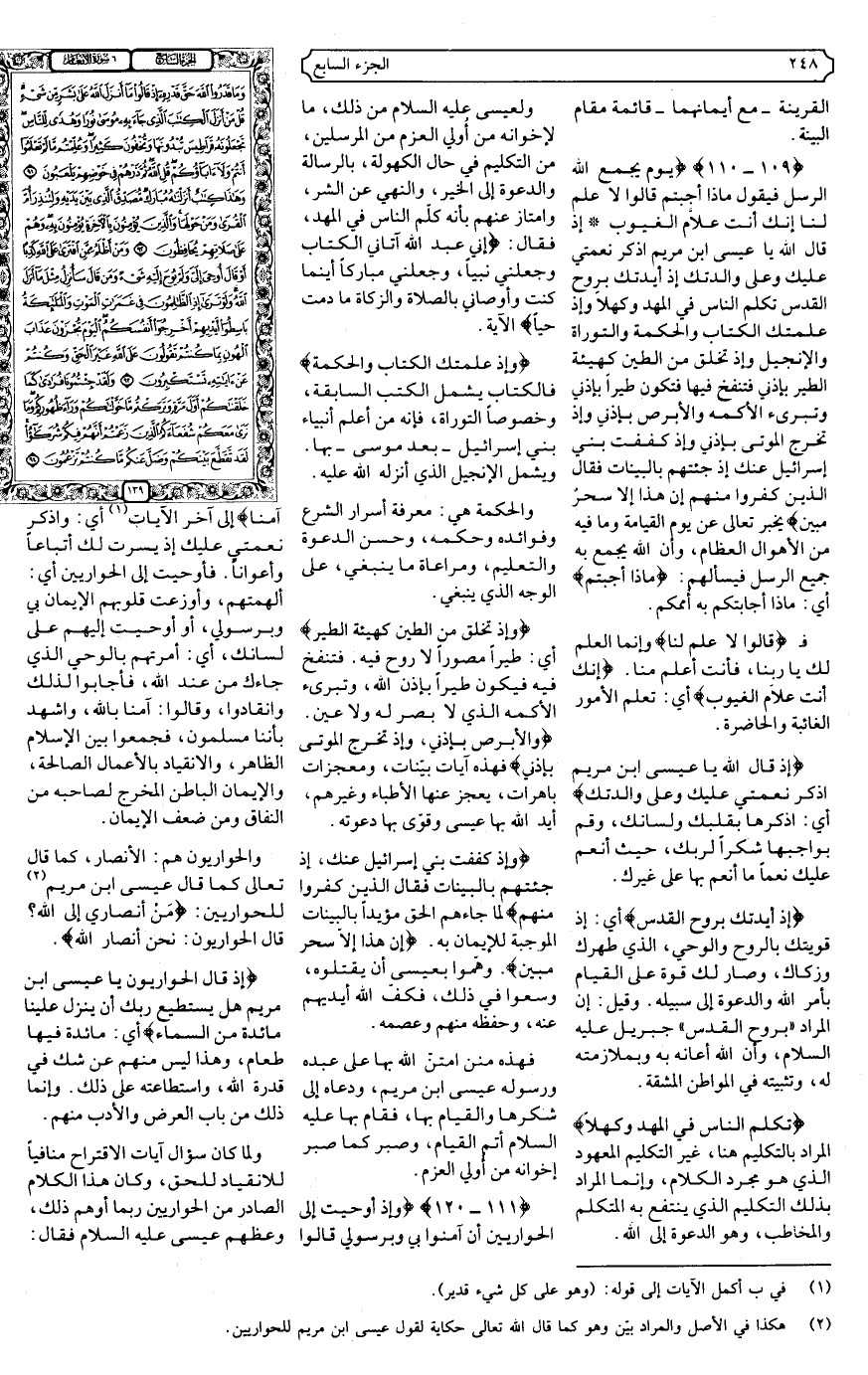 {109، 110} {يَوْمَ يَجْمَعُ اللَّهُ الرُّسُلَ فَيَقُولُ مَاذَا أُجِبْتُمْ قَالُوا لا عِلْمَ لَنَا إِنَّكَ أَنْتَ عَلامُ الْغُيُوبِ * إِذْ قَالَ اللَّهُ يَا عِيسَى ابْنَ مَرْيَمَ اذْكُرْ نِعْمَتِي عَلَيْكَ وَعَلى وَالِدَتِكَ إِذْ أَيَّدْتُكَ بِرُوحِ الْقُدُسِ تُكَلِّمُ النَّاسَ فِي الْمَهْدِ وَكَهْلا وَإِذْ عَلَّمْتُكَ الْكِتَابَ وَالْحِكْمَةَ وَالتَّوْرَاةَ وَالإنْجِيلَ وَإِذْ تَخْلُقُ مِنَ الطِّينِ كَهَيْئَةِ الطَّيْرِ بِإِذْنِي فَتَنْفُخُ فِيهَا فَتَكُونُ طَيْرًا بِإِذْنِي وَتُبْرِئُ الأكْمَهَ وَالأبْرَصَ بِإِذْنِي وَإِذْ تُخْرِجُ الْمَوْتَى بِإِذْنِي وَإِذْ كَفَفْتُ بَنِي إِسْرَائِيلَ عَنْكَ إِذْ جِئْتَهُمْ بِالْبَيِّنَاتِ فَقَالَ الَّذِينَ كَفَرُوا مِنْهُمْ إِنْ هَذَا إِلا سِحْرٌ مُبِينٌ} .