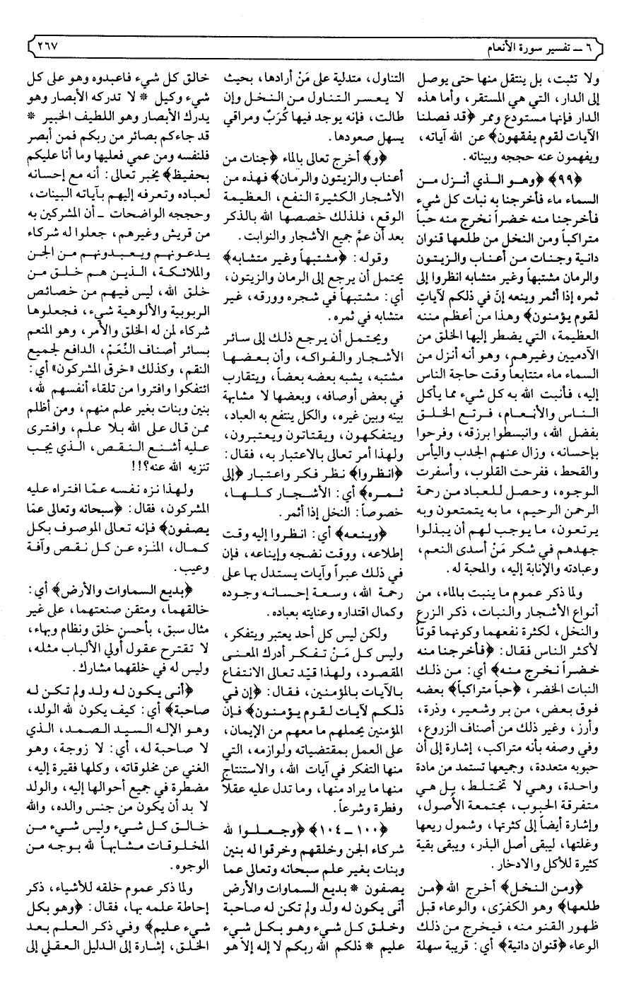 {99} {وَهُوَ الَّذِي أَنْزَلَ مِنَ السَّمَاءِ مَاءً فَأَخْرَجْنَا بِهِ نَبَاتَ كُلِّ شَيْءٍ فَأَخْرَجْنَا مِنْهُ خَضِرًا نُخْرِجُ مِنْهُ حَبًّا مُتَرَاكِبًا وَمِنَ النَّخْلِ مِنْ طَلْعِهَا قِنْوَانٌ دَانِيَةٌ وَجَنَّاتٍ مِنْ أَعْنَابٍ وَالزَّيْتُونَ وَالرُّمَّانَ مُشْتَبِهًا وَغَيْرَ مُتَشَابِهٍ انْظُرُوا إِلَى ثَمَرِهِ إِذَا أَثْمَرَ وَيَنْعِهِ إِنَّ فِي ذَلِكُمْ لآيَاتٍ لِقَوْمٍ يُؤْمِنُونَ} .