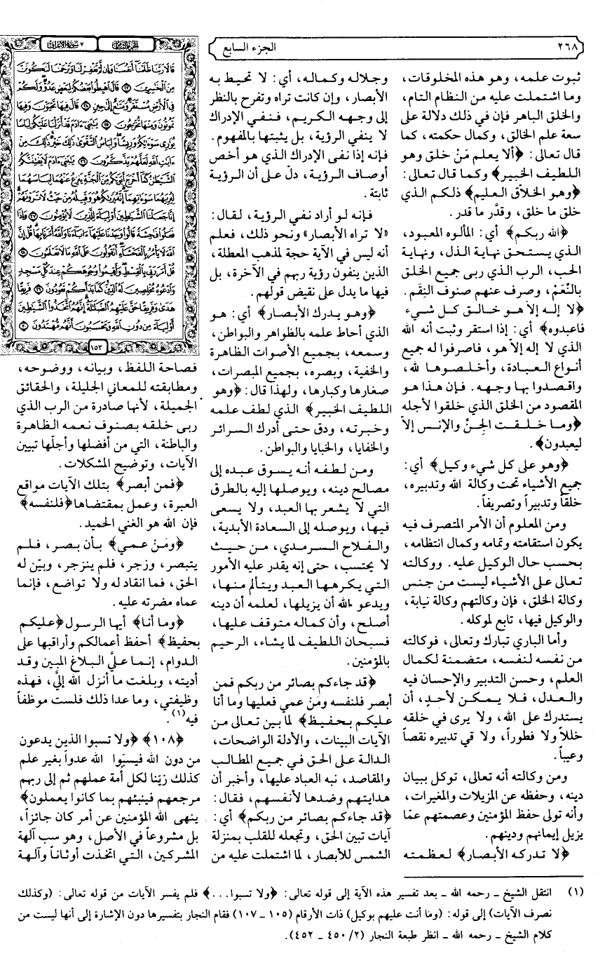 (1) انتقل الشيخ -رحمه الله- بعد تفسير هذه الآية إلى قوله تعالى: (ولا تسبوا ... ) فلم يفسر الآيات من قوله تعالى: (وكذلك نصرف الآيات) إلى قوله: (وما أنت عليهم بوكيل) ذات الأرقام (105-107) فقام النجار بتفسيرها دون الإشارة إلى أنها ليست من كلام الشيخ -رحمه الله- انظر طبعة النجار (2/450-452) .