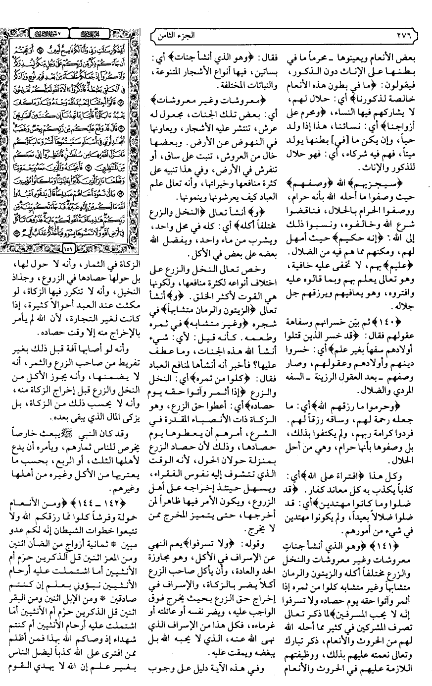 {141} {وَهُوَ الَّذِي أَنْشَأَ جَنَّاتٍ مَعْرُوشَاتٍ وَغَيْرَ مَعْرُوشَاتٍ وَالنَّخْلَ وَالزَّرْعَ مُخْتَلِفًا أُكُلُهُ وَالزَّيْتُونَ وَالرُّمَّانَ مُتَشَابِهًا وَغَيْرَ مُتَشَابِهٍ كُلُوا مِنْ ثَمَرِهِ إِذَا أَثْمَرَ وَآتُوا حَقَّهُ يَوْمَ حَصَادِهِ وَلا تُسْرِفُوا إِنَّهُ لا يُحِبُّ الْمُسْرِفِينَ} .