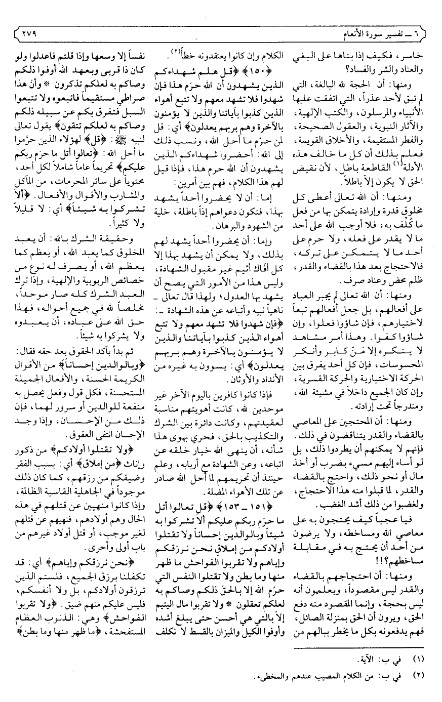{151 - 153} {قُلْ تَعَالَوْا أَتْلُ مَا حَرَّمَ رَبُّكُمْ عَلَيْكُمْ أَلا تُشْرِكُوا بِهِ شَيْئًا وَبِالْوَالِدَيْنِ إِحْسَانًا وَلا تَقْتُلُوا أَوْلادَكُمْ مِنْ إِمْلاقٍ نَحْنُ نَرْزُقُكُمْ وَإِيَّاهُمْ وَلا تَقْرَبُوا الْفَوَاحِشَ مَا ظَهَرَ مِنْهَا وَمَا بَطَنَ وَلا تَقْتُلُوا النَّفْسَ الَّتِي حَرَّمَ اللَّهُ إِلا بِالْحَقِّ ذَلِكُمْ وَصَّاكُمْ بِهِ لَعَلَّكُمْ تَعْقِلُونَ} .