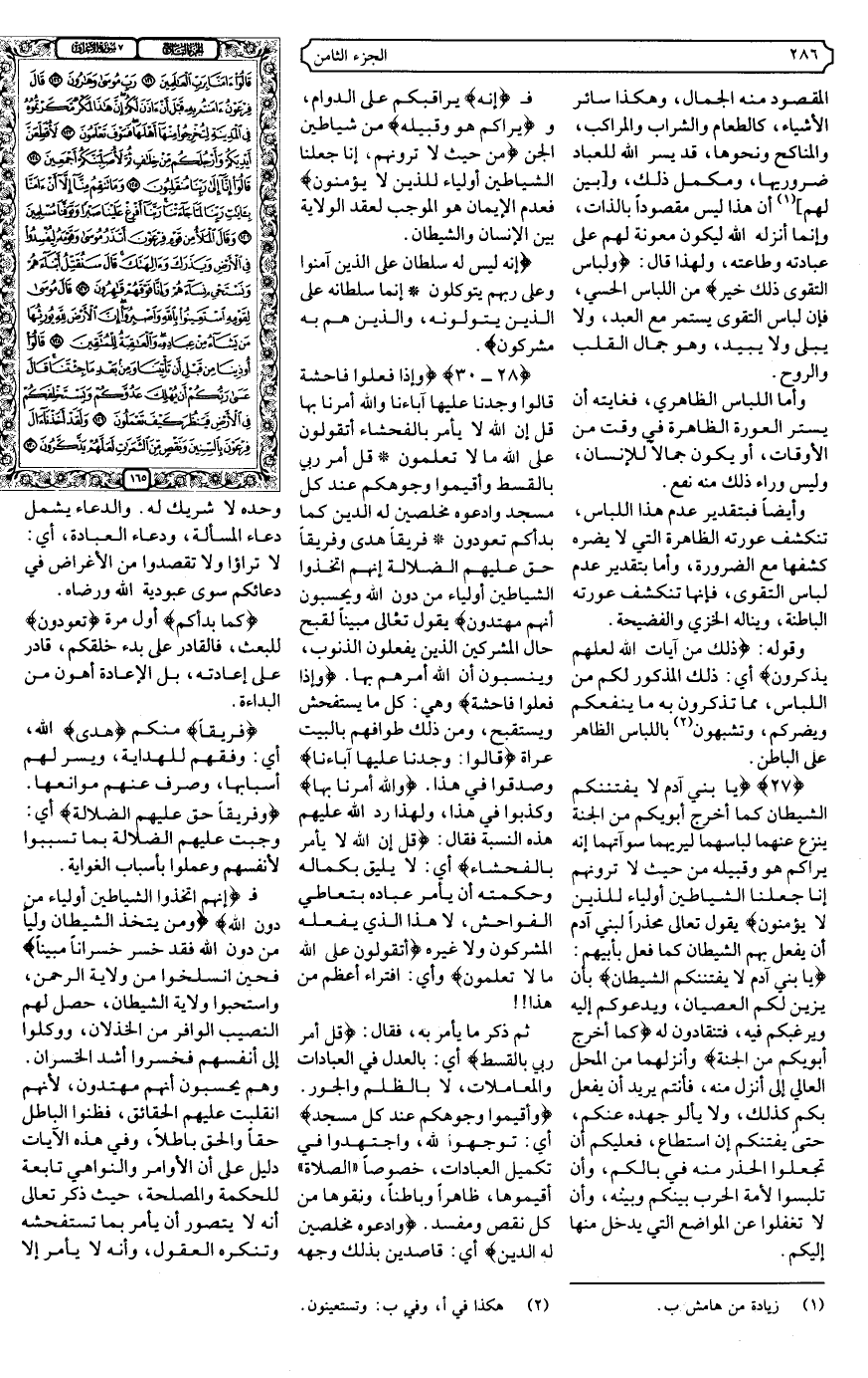 {28 - 30} {وَإِذَا فَعَلُوا فَاحِشَةً قَالُوا وَجَدْنَا عَلَيْهَا آبَاءَنَا وَاللَّهُ أَمَرَنَا بِهَا قُلْ إِنَّ اللَّهَ لا يَأْمُرُ بِالْفَحْشَاءِ أَتَقُولُونَ عَلَى اللَّهِ مَا لا تَعْلَمُونَ * قُلْ أَمَرَ رَبِّي بِالْقِسْطِ وَأَقِيمُوا وُجُوهَكُمْ عِنْدَ كُلِّ مَسْجِدٍ وَادْعُوهُ مُخْلِصِينَ لَهُ الدِّينَ كَمَا بَدَأَكُمْ تَعُودُونَ * فَرِيقًا هَدَى وَفَرِيقًا حَقَّ عَلَيْهِمُ الضَّلالَةُ إِنَّهُمُ اتَّخَذُوا الشَّيَاطِينَ أَوْلِيَاءَ مِنْ دُونِ اللَّهِ وَيَحْسَبُونَ أَنَّهُمْ مُهْتَدُونَ} .