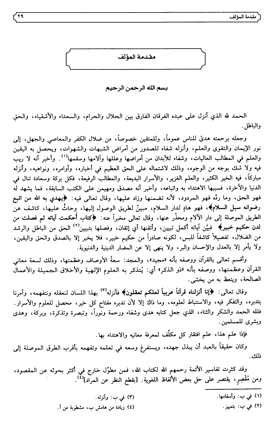 وقال تعالى: {إِنَّا أَنزلْنَاهُ قُرْآنًا عَرَبِيًّا لَعَلَّكُمْ تَعْقِلُونَ} فأنزله (3) بهذا اللسان لنعقله ونتفهمه، وأمرنا بتدبره، والتفكر فيه، والاستنباط لعلومه، وما ذاك إلا لأن تدبره مفتاح كل خير، محصل للعلوم والأسرار. فلله الحمد والشكر والثناء، الذي جعل كتابه هدى وشفاء ورحمة ونورا، وتبصرة وتذكرة، وبركة، وهدى وبشرى للمسلمين.