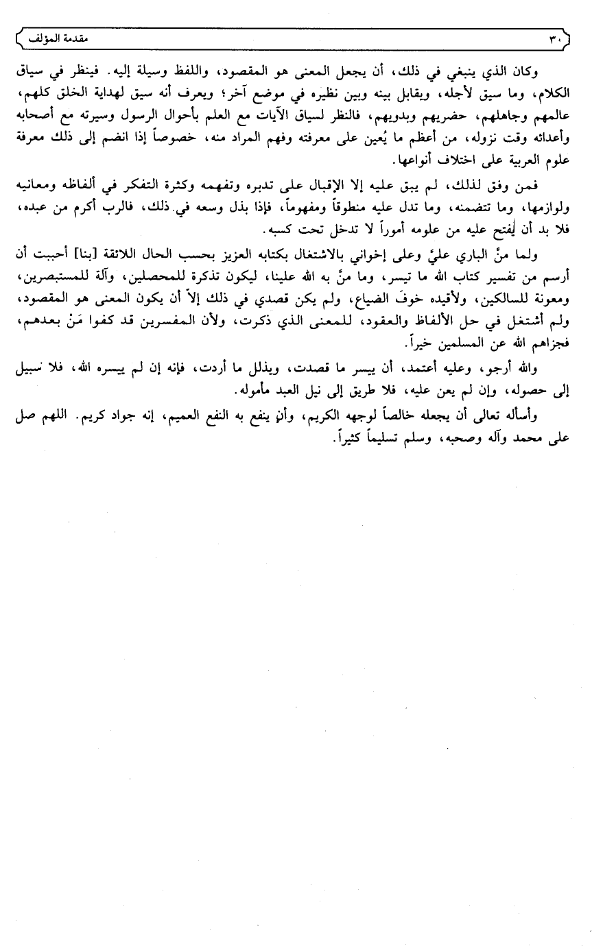 ولما من الباري علي وعلى إخواني بالاشتغال بكتابه العزيز بحسب الحال اللائقة [بنا] أحببت أن أرسم من تفسير كتاب الله ما تيسر، وما من به الله علينا، ليكون تذكرة للمحصلين، وآلة للمستبصرين، ومعونة للسالكين، ولأقيده خوف الضياع، ولم يكن قصدي في ذلك إلا أن يكون المعنى هو المقصود، ولم أشتغل في حل الألفاظ والعقود، للمعنى الذي ذكرت، ولأن المفسرين قد كفوا من بعدهم، فجزاهم الله عن المسلمين خيرا.