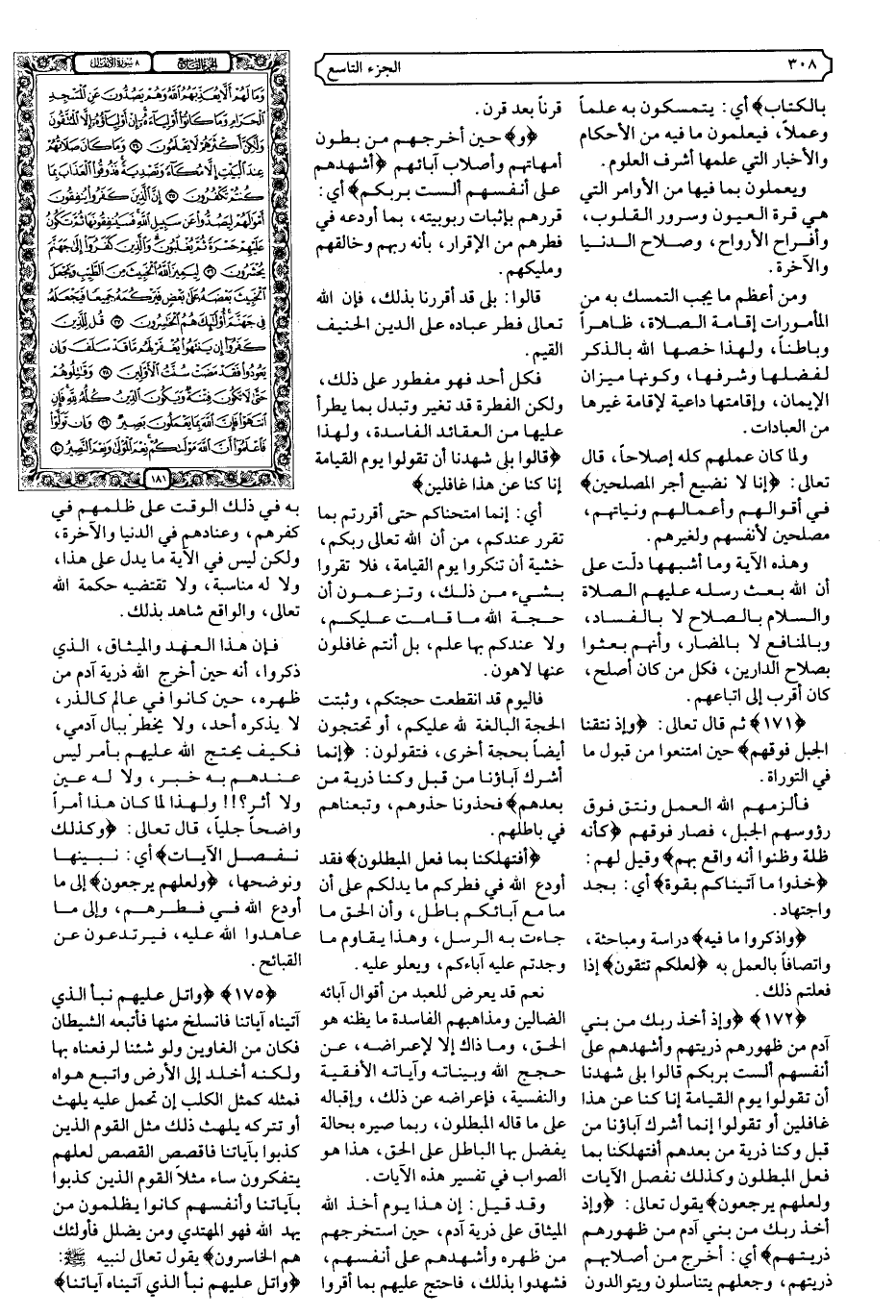 {172 -174} {وَإِذْ أَخَذَ رَبُّكَ مِنْ بَنِي آدَمَ مِنْ ظُهُورِهِمْ ذُرِّيَّتَهُمْ وَأَشْهَدَهُمْ عَلَى أَنْفُسِهِمْ أَلَسْتُ بِرَبِّكُمْ قَالُوا بَلَى شَهِدْنَا أَنْ تَقُولُوا يَوْمَ الْقِيَامَةِ إِنَّا كُنَّا عَنْ هَذَا غَافِلِينَ * أَوْ تَقُولُوا إِنَّمَا أَشْرَكَ آبَاؤُنَا مِنْ قَبْلُ وَكُنَّا ذُرِّيَّةً مِنْ بَعْدِهِمْ أَفَتُهْلِكُنَا بِمَا فَعَلَ الْمُبْطِلُونَ * وَكَذَلِكَ نُفَصِّلُ الآيَاتِ وَلَعَلَّهُمْ يَرْجِعُونَ} .