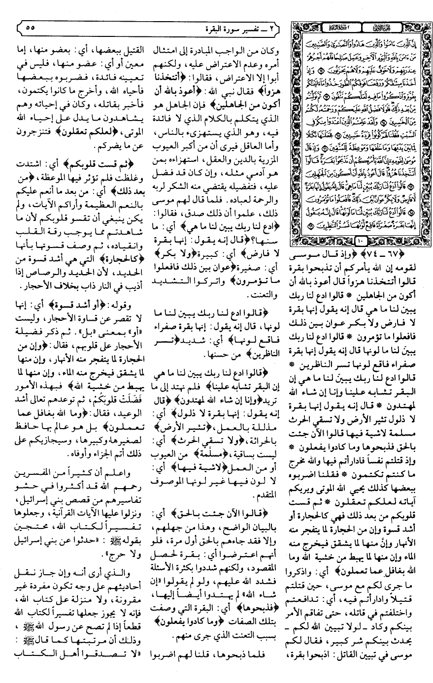 {قَالُوا ادْعُ لَنَا رَبَّكَ يُبَيِّنْ لَنَا مَا هِيَ إِنَّ الْبَقَرَ تَشَابَهَ عَلَيْنَا وَإِنَّا إِنْ شَاءَ اللَّهُ لَمُهْتَدُونَ * قَالَ إِنَّهُ يَقُولُ إِنَّهَا بَقَرَةٌ لا ذَلُولٌ تُثِيرُ الأرْضَ وَلا تَسْقِي الْحَرْثَ مُسَلَّمَةٌ لا شِيَةَ فِيهَا قَالُوا الآنَ جِئْتَ بِالْحَقِّ فَذَبَحُوهَا وَمَا كَادُوا يَفْعَلُونَ * وَإِذْ قَتَلْتُمْ نَفْسًا فَادَّارَأْتُمْ فِيهَا وَاللَّهُ مُخْرِجٌ مَا كُنْتُمْ تَكْتُمُونَ * فَقُلْنَا اضْرِبُوهُ بِبَعْضِهَا كَذَلِكَ يُحْيِي اللَّهُ الْمَوْتَى وَيُرِيكُمْ آيَاتِهِ لَعَلَّكُمْ تَعْقِلُونَ * ثُمَّ قَسَتْ قُلُوبُكُمْ مِنْ بَعْدِ ذَلِكَ فَهِيَ كَالْحِجَارَةِ أَوْ أَشَدُّ قَسْوَةً وَإِنَّ مِنَ الْحِجَارَةِ لَمَا يَتَفَجَّرُ مِنْهُ الأنْهَارُ وَإِنَّ مِنْهَا لَمَا يَشَّقَّقُ فَيَخْرُجُ مِنْهُ الْمَاءُ وَإِنَّ مِنْهَا لَمَا يَهْبِطُ مِنْ خَشْيَةِ اللَّهِ وَمَا اللَّهُ بِغَافِلٍ عَمَّا تَعْمَلُونَ} .