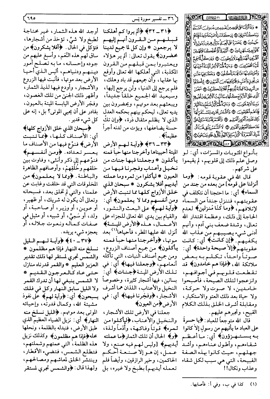 أي: {وَآيَةٌ لَهُمُ} على البعث والنشور، والقيام بين يدي الله تعالى للجزاء على الأعمال، هذه {الأرْضُ الْمَيْتَةُ} أنزل الله عليها المطر، فأحياها (1) بعد موتها، {وَأَخْرَجْنَا مِنْهَا حَبًّا فَمِنْهُ يَأْكُلُونَ} من جميع أصناف الزروع، ومن جميع أصناف النبات، التي تأكله أنعامهم، {وَجَعَلْنَا فِيهَا} أي: في تلك الأرض الميتة {جَنَّاتٍ} أي: بساتين، فيها أشجار كثيرة، وخصوصا النخيل والأعناب، اللذان هما أشرف الأشجار، {وَفَجَّرْنَا فِيهَا} أي: في الأرض {مِنَ الْعُيُونِ}