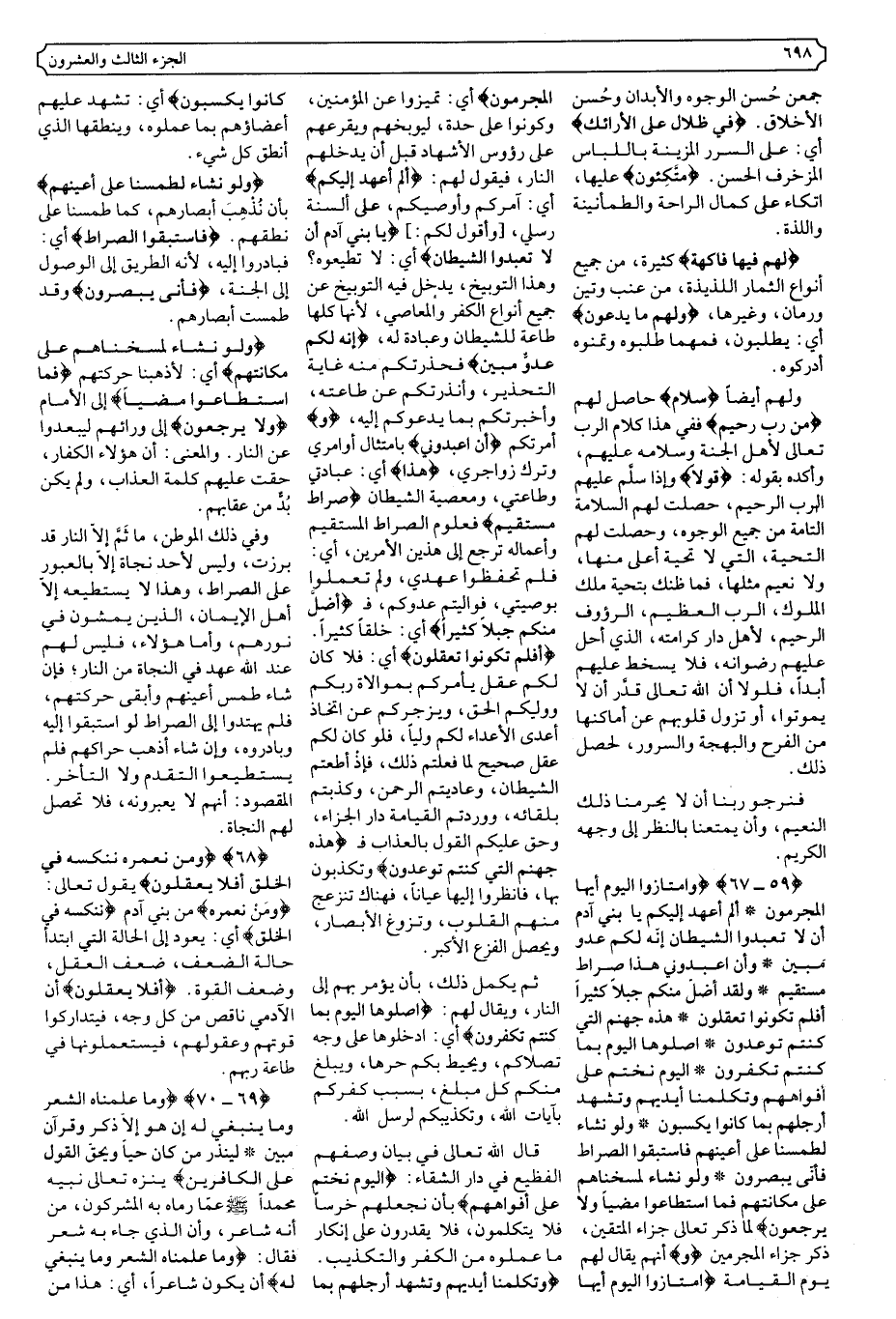 {59 - 67} {وَامْتَازُوا الْيَوْمَ أَيُّهَا الْمُجْرِمُونَ * أَلَمْ أَعْهَدْ إِلَيْكُمْ يَا بَنِي آدَمَ أَنْ لا تَعْبُدُوا الشَّيْطَانَ إِنَّهُ لَكُمْ عَدُوٌّ مُبِينٌ * وَأَنِ اعْبُدُونِي هَذَا صِرَاطٌ مُسْتَقِيمٌ * وَلَقَدْ أَضَلَّ مِنْكُمْ جِبِلا كَثِيرًا أَفَلَمْ تَكُونُوا تَعْقِلُونَ * هَذِهِ جَهَنَّمُ الَّتِي كُنْتُمْ تُوعَدُونَ * اصْلَوْهَا الْيَوْمَ بِمَا كُنْتُمْ تَكْفُرُونَ * الْيَوْمَ نَخْتِمُ عَلَى أَفْوَاهِهِمْ وَتُكَلِّمُنَا أَيْدِيهِمْ وَتَشْهَدُ أَرْجُلُهُمْ بِمَا كَانُوا يَكْسِبُونَ * وَلَوْ نَشَاءُ لَطَمَسْنَا عَلَى أَعْيُنِهِمْ فَاسْتَبَقُوا الصِّرَاطَ فَأَنَّى يُبْصِرُونَ * وَلَوْ نَشَاءُ لَمَسَخْنَاهُمْ عَلَى مَكَانَتِهِمْ فَمَا اسْتَطَاعُوا مُضِيًّا وَلا يَرْجِعُونَ} .