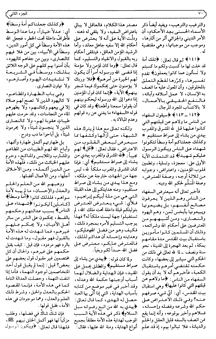 {142 - 143} {سَيَقُولُ السُّفَهَاءُ مِنَ النَّاسِ مَا وَلاهُمْ عَنْ قِبْلَتِهِمُ الَّتِي كَانُوا عَلَيْهَا قُلْ لِلَّهِ الْمَشْرِقُ وَالْمَغْرِبُ يَهْدِي مَنْ يَشَاءُ إِلَى صِرَاطٍ مُسْتَقِيمٍ * وَكَذَلِكَ جَعَلْنَاكُمْ أُمَّةً وَسَطًا لِتَكُونُوا شُهَدَاءَ عَلَى النَّاسِ وَيَكُونَ الرَّسُولُ عَلَيْكُمْ شَهِيدًا وَمَا جَعَلْنَا الْقِبْلَةَ الَّتِي كُنْتَ عَلَيْهَا إِلا لِنَعْلَمَ مَنْ يَتَّبِعُ الرَّسُولَ مِمَّنْ يَنْقَلِبُ عَلَى عَقِبَيْهِ وَإِنْ كَانَتْ لَكَبِيرَةً إِلا عَلَى الَّذِينَ هَدَى اللَّهُ وَمَا كَانَ اللَّهُ لِيُضِيعَ إِيمَانَكُمْ إِنَّ اللَّهَ بِالنَّاسِ لَرَءُوفٌ رَحِيمٌ} .