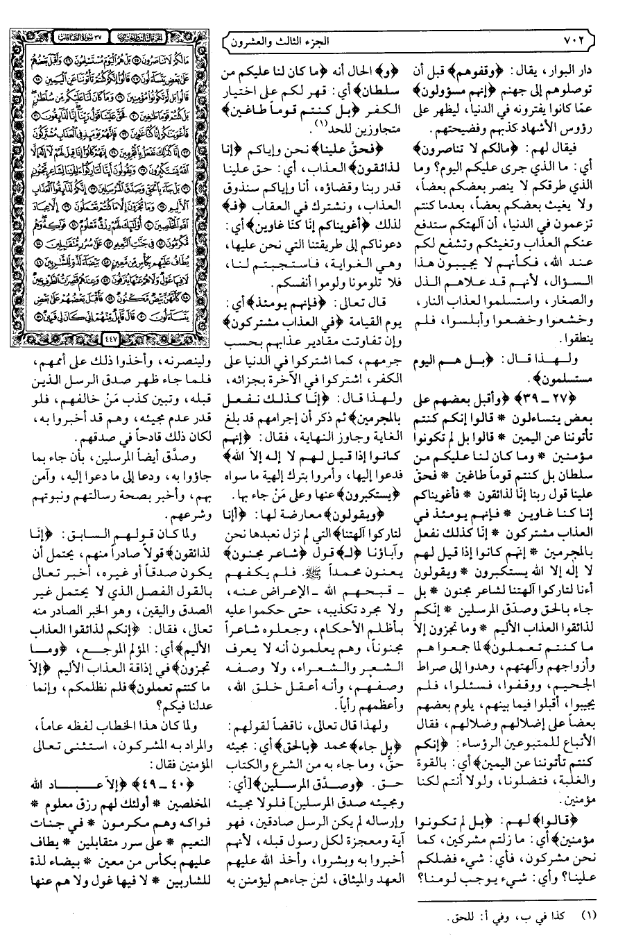{27 - 39} {وَأَقْبَلَ بَعْضُهُمْ عَلَى بَعْضٍ يَتَسَاءَلُونَ * قَالُوا إِنَّكُمْ كُنْتُمْ تَأْتُونَنَا عَنِ الْيَمِينِ * قَالُوا بَلْ لَمْ تَكُونُوا مُؤْمِنِينَ * وَمَا كَانَ لَنَا عَلَيْكُمْ مِنْ سُلْطَانٍ بَلْ كُنْتُمْ قَوْمًا طَاغِينَ * فَحَقَّ عَلَيْنَا قَوْلُ رَبِّنَا إِنَّا لَذَائِقُونَ * فَأَغْوَيْنَاكُمْ إِنَّا كُنَّا غَاوِينَ * فَإِنَّهُمْ يَوْمَئِذٍ فِي الْعَذَابِ مُشْتَرِكُونَ * إِنَّا كَذَلِكَ نَفْعَلُ بِالْمُجْرِمِينَ * إِنَّهُمْ كَانُوا إِذَا قِيلَ لَهُمْ لا إِلَهَ إِلا اللَّهُ يَسْتَكْبِرُونَ * وَيَقُولُونَ أَئِنَّا لَتَارِكُو آلِهَتِنَا لِشَاعِرٍ مَجْنُونٍ * بَلْ جَاءَ بِالْحَقِّ وَصَدَّقَ الْمُرْسَلِينَ * إِنَّكُمْ لَذَائِقُو الْعَذَابِ الألِيمِ * وَمَا تُجْزَوْنَ إِلا مَا كُنْتُمْ تَعْمَلُونَ} .