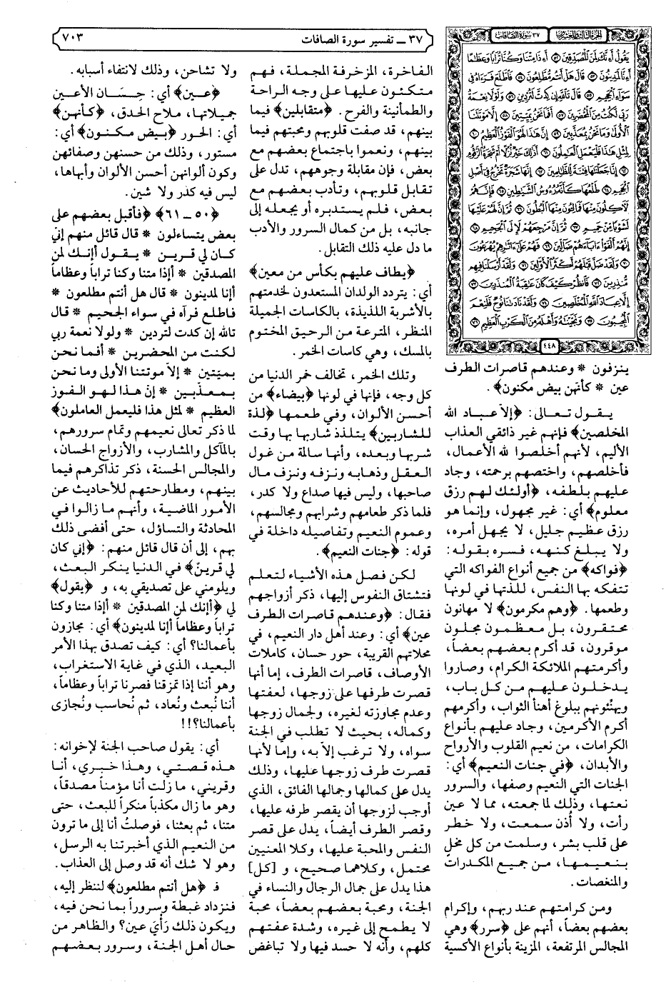{يَقُولُ أَئِنَّكَ لَمِنَ الْمُصَدِّقِينَ * أَئِذَا مِتْنَا وَكُنَّا تُرَابًا وَعِظَامًا أَئِنَّا لَمَدِينُونَ * قَالَ هَلْ أَنْتُمْ مُطَّلِعُونَ * فَاطَّلَعَ فَرَآهُ فِي سَوَاءِ الْجَحِيمِ * قَالَ تَاللَّهِ إِنْ كِدْتَ لَتُرْدِينِ * وَلَوْلا نِعْمَةُ رَبِّي لَكُنْتُ مِنَ الْمُحْضَرِينَ * أَفَمَا نَحْنُ بِمَيِّتِينَ * إِلا مَوْتَتَنَا الأولَى وَمَا نَحْنُ بِمُعَذَّبِينَ * إِنَّ هَذَا لَهُوَ الْفَوْزُ الْعَظِيمُ * لِمِثْلِ هَذَا فَلْيَعْمَلِ الْعَامِلُونَ} .