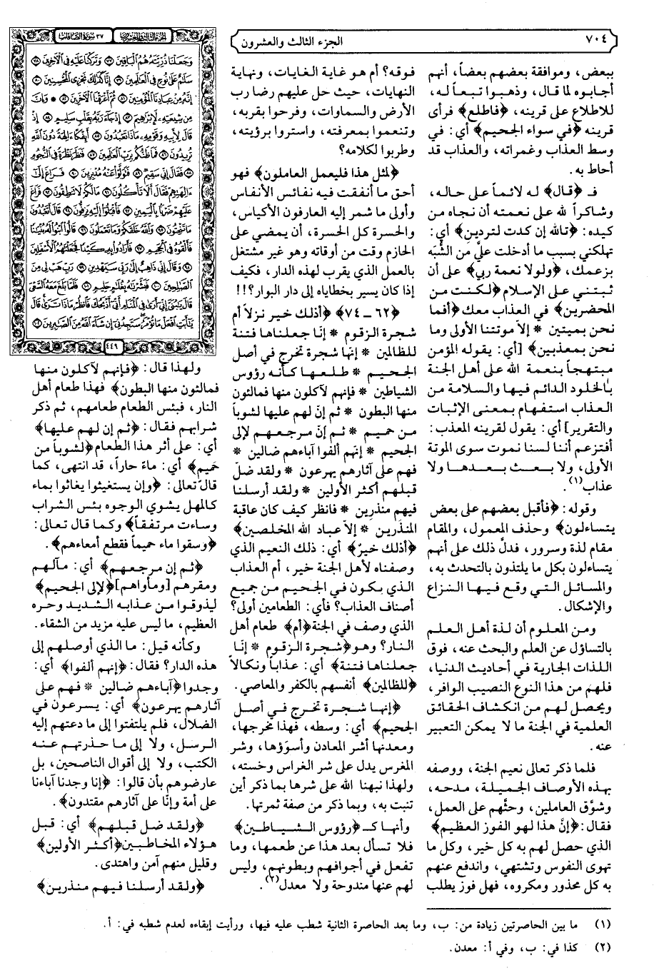 {62 - 74} {أَذَلِكَ خَيْرٌ نُزُلا أَمْ شَجَرَةُ الزَّقُّومِ * إِنَّا جَعَلْنَاهَا فِتْنَةً لِلظَّالِمِينَ * إِنَّهَا شَجَرَةٌ تَخْرُجُ فِي أَصْلِ الْجَحِيمِ * طَلْعُهَا كَأَنَّهُ رُءُوسُ الشَّيَاطِينِ * فَإِنَّهُمْ لآكِلُونَ مِنْهَا فَمَالِئُونَ مِنْهَا الْبُطُونَ * ثُمَّ إِنَّ لَهُمْ عَلَيْهَا لَشَوْبًا مِنْ حَمِيمٍ * ثُمَّ إِنَّ مَرْجِعَهُمْ لإلَى الْجَحِيمِ * إِنَّهُمْ أَلْفَوْا آبَاءَهُمْ ضَالِّينَ * فَهُمْ عَلَى آثَارِهِمْ يُهْرَعُونَ * وَلَقَدْ ضَلَّ قَبْلَهُمْ أَكْثَرُ الأوَّلِينَ * وَلَقَدْ أَرْسَلْنَا فِيهِمْ مُنْذِرِينَ * فَانْظُرْ كَيْفَ كَانَ عَاقِبَةُ الْمُنْذَرِينَ * إِلا عِبَادَ اللَّهِ الْمُخْلَصِينَ} .