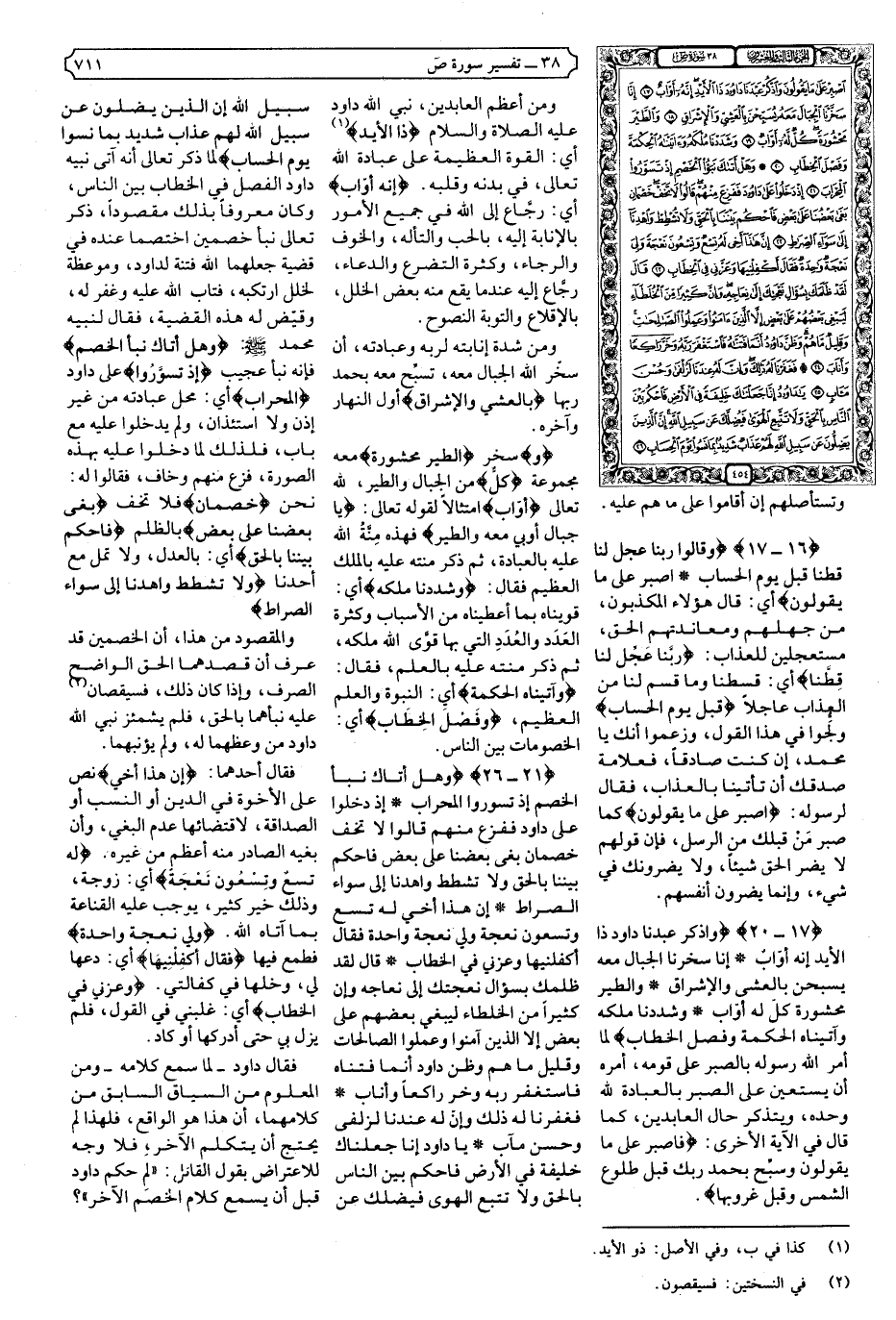 {21 - 26} {وَهَلْ أَتَاكَ نَبَأُ الْخَصْمِ إِذْ تَسَوَّرُوا الْمِحْرَابَ * إِذْ دَخَلُوا عَلَى دَاوُدَ فَفَزِعَ مِنْهُمْ قَالُوا لا تَخَفْ خَصْمَانِ بَغَى بَعْضُنَا عَلَى بَعْضٍ فَاحْكُمْ بَيْنَنَا بِالْحَقِّ وَلا تُشْطِطْ وَاهْدِنَا إِلَى سَوَاءِ الصِّرَاطِ * إِنَّ هَذَا أَخِي لَهُ تِسْعٌ وَتِسْعُونَ نَعْجَةً وَلِيَ نَعْجَةٌ وَاحِدَةٌ فَقَالَ أَكْفِلْنِيهَا وَعَزَّنِي فِي الْخِطَابِ * قَالَ لَقَدْ ظَلَمَكَ بِسُؤَالِ نَعْجَتِكَ إِلَى نِعَاجِهِ وَإِنَّ كَثِيرًا مِنَ الْخُلَطَاءِ لَيَبْغِي بَعْضُهُمْ عَلَى بَعْضٍ إِلا الَّذِينَ آمَنُوا وَعَمِلُوا الصَّالِحَاتِ وَقَلِيلٌ مَا هُمْ وَظَنَّ دَاوُدُ أَنَّمَا فَتَنَّاهُ فَاسْتَغْفَرَ رَبَّهُ وَخَرَّ رَاكِعًا وَأَنَابَ * فَغَفَرْنَا لَهُ ذَلِكَ وَإِنَّ لَهُ عِنْدَنَا لَزُلْفَى وَحُسْنَ مَآبٍ * يَا دَاوُدُ إِنَّا جَعَلْنَاكَ خَلِيفَةً فِي الأرْضِ فَاحْكُمْ بَيْنَ النَّاسِ بِالْحَقِّ وَلا تَتَّبِعِ الْهَوَى فَيُضِلَّكَ عَنْ سَبِيلِ اللَّهِ إِنَّ الَّذِينَ يَضِلُّونَ عَنْ سَبِيلِ اللَّهِ لَهُمْ عَذَابٌ شَدِيدٌ بِمَا نَسُوا يَوْمَ الْحِسَابِ} .