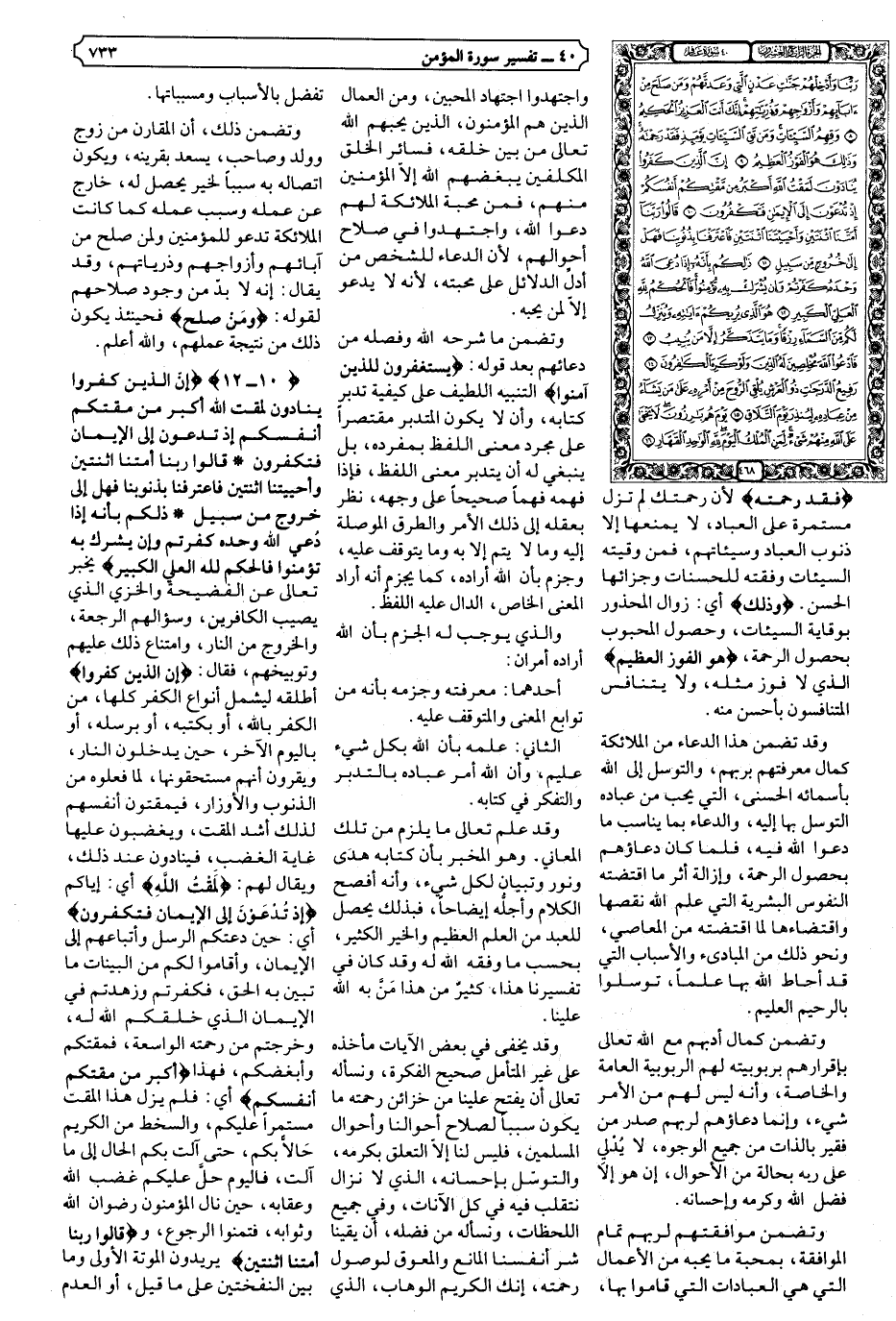يخبر تعالى عن الفضيحة والخزي الذي يصيب الكافرين، وسؤالهم الرجعة، والخروج من النار، وامتناع ذلك عليهم وتوبيخهم، فقال: {إِنَّ الَّذِينَ كَفَرُوا} أطلقه ليشمل أنواع الكفر كلها، من الكفر بالله، أو بكتبه، أو برسله، أو باليوم الآخر، حين يدخلون النار، ويقرون أنهم مستحقونها، لما فعلوه من الذنوب والأوزار، فيمقتون أنفسهم لذلك أشد المقت، ويغضبون عليها غاية الغضب، فينادون عند ذلك، ويقال لهم: {لَمَقْتُ اللَّهِ} أي: إياكم {إِذْ تُدْعَوْنَ إِلَى الإيمَانِ فَتَكْفُرُونَ} أي: حين دعتكم الرسل وأتباعهم إلى الإيمان، وأقاموا لكم من البينات ما تبين به الحق، فكفرتم وزهدتم في الإيمان الذي خلقكم الله له، وخرجتم من رحمته الواسعة، فمقتكم وأبغضكم، فهذا {أَكْبَرُ مِنْ مَقْتِكُمْ أَنْفُسَكُمْ} أي: فلم يزل هذا المقت مستمرًا عليكم، والسخط من الكريم حَالا بكم، حتى آلت بكم الحال إلى ما آلت، فاليوم حلَّ عليكم غضب الله وعقابه حين نال المؤمنون رضوان الله وثوابه.