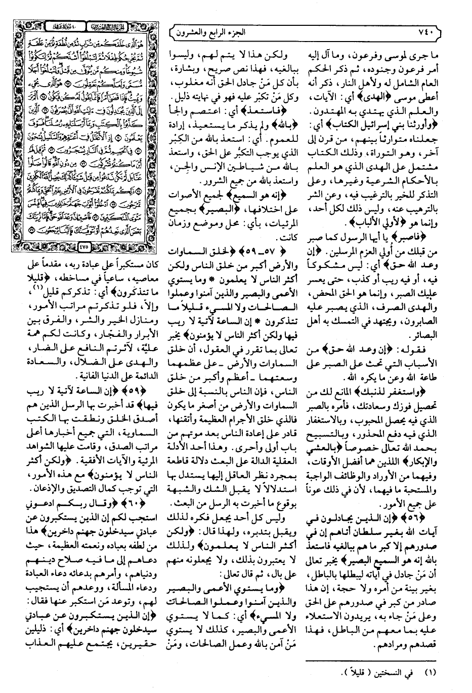 {57 - 59} {لَخَلْقُ السَّمَاوَاتِ وَالأرْضِ أَكْبَرُ مِنْ خَلْقِ النَّاسِ وَلَكِنَّ أَكْثَرَ النَّاسِ لا يَعْلَمُونَ * وَمَا يَسْتَوِي الأعْمَى وَالْبَصِيرُ وَالَّذِينَ آمَنُوا وَعَمِلُوا الصَّالِحَاتِ وَلا الْمُسِيءُ قَلِيلا مَا تَتَذَكَّرُونَ} .