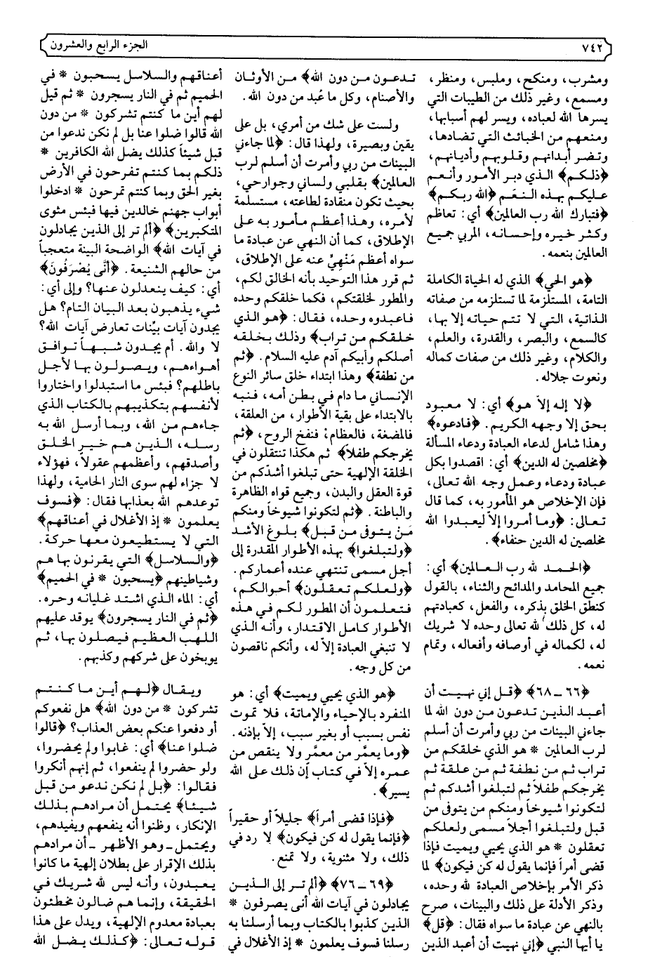 {69 - 76} {أَلَمْ تَرَ إِلَى الَّذِينَ يُجَادِلُونَ فِي آيَاتِ اللَّهِ أَنَّى يُصْرَفُونَ * الَّذِينَ كَذَّبُوا بِالْكِتَابِ وَبِمَا أَرْسَلْنَا بِهِ رُسُلَنَا فَسَوْفَ يَعْلَمُونَ * إِذِ الأغْلالُ فِي أَعْنَاقِهِمْ وَالسَّلاسِلُ يُسْحَبُونَ * فِي الْحَمِيمِ ثُمَّ فِي النَّارِ يُسْجَرُونَ * ثُمَّ قِيلَ لَهُمْ أَيْنَ مَا كُنْتُمْ تُشْرِكُونَ * مِنْ دُونِ اللَّهِ قَالُوا ضَلُّوا عَنَّا بَلْ لَمْ نَكُنْ نَدْعُو مِنْ قَبْلُ شَيْئًا كَذَلِكَ يُضِلُّ اللَّهُ الْكَافِرِينَ * ذَلِكُمْ بِمَا كُنْتُمْ تَفْرَحُونَ فِي الأرْضِ بِغَيْرِ الْحَقِّ وَبِمَا كُنْتُمْ تَمْرَحُونَ * ادْخُلُوا أَبْوَابَ جَهَنَّمَ خَالِدِينَ فِيهَا فَبِئْسَ مَثْوَى الْمُتَكَبِّرِينَ} .