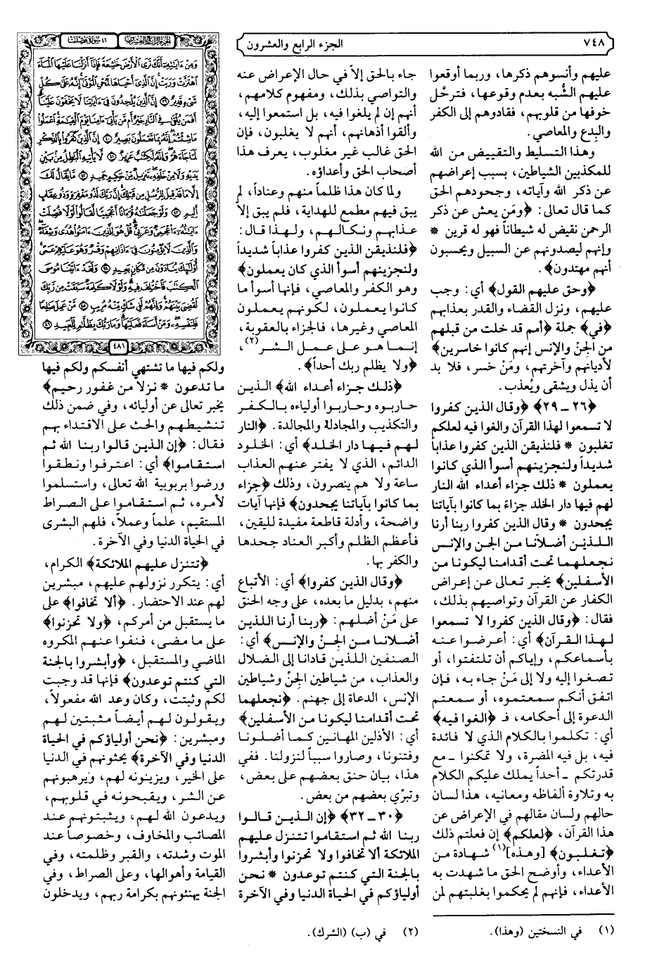 {26 - 29} {وَقَالَ الَّذِينَ كَفَرُوا لا تَسْمَعُوا لِهَذَا الْقُرْآنِ وَالْغَوْا فِيهِ لَعَلَّكُمْ تَغْلِبُونَ * فَلَنُذِيقَنَّ الَّذِينَ كَفَرُوا عَذَابًا شَدِيدًا وَلَنَجْزِيَنَّهُمْ أَسْوَأَ الَّذِي كَانُوا يَعْمَلُونَ * ذَلِكَ جَزَاءُ أَعْدَاءِ اللَّهِ النَّارُ لَهُمْ فِيهَا دَارُ الْخُلْدِ جَزَاءً بِمَا كَانُوا بِآيَاتِنَا يَجْحَدُونَ * وَقَالَ الَّذِينَ كَفَرُوا رَبَّنَا أَرِنَا الَّذَيْنِ أَضَلانَا مِنَ الْجِنِّ وَالإنْسِ نَجْعَلْهُمَا تَحْتَ أَقْدَامِنَا لِيَكُونَا مِنَ الأسْفَلِينَ} .