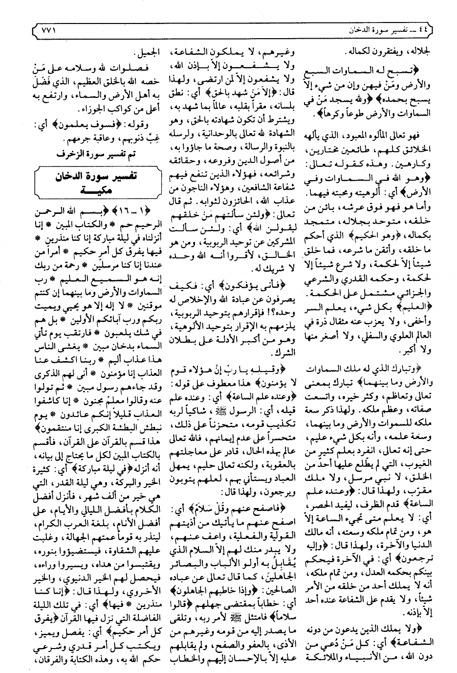 {1-16} {بِسْمِ اللَّهِ الرَّحْمَنِ الرَّحِيمِ حم * وَالْكِتَابِ الْمُبِينِ * إِنَّا أَنْزَلْنَاهُ فِي لَيْلَةٍ مُبَارَكَةٍ إِنَّا كُنَّا مُنْذِرِينَ * فِيهَا يُفْرَقُ كُلُّ أَمْرٍ حَكِيمٍ * أَمْرًا مِنْ عِنْدِنَا إِنَّا كُنَّا مُرْسِلِينَ * رَحْمَةً مِنْ رَبِّكَ إِنَّهُ هُوَ السَّمِيعُ الْعَلِيمُ * رَبُّ السَّمَاوَاتِ وَالأرْضِ وَمَا بَيْنَهُمَا إِنْ كُنْتُمْ مُوقِنِينَ * لا إِلَهَ إِلا هُوَ يُحْيِي وَيُمِيتُ رَبُّكُمْ وَرَبُّ آبَائِكُمُ الأوَّلِينَ * بَلْ هُمْ فِي شَكٍّ يَلْعَبُونَ * فَارْتَقِبْ يَوْمَ تَأْتِي السَّمَاءُ بِدُخَانٍ مُبِينٍ * يَغْشَى النَّاسَ هَذَا عَذَابٌ أَلِيمٌ * رَبَّنَا اكْشِفْ عَنَّا الْعَذَابَ إِنَّا مُؤْمِنُونَ * أَنَّى لَهُمُ الذِّكْرَى وَقَدْ جَاءَهُمْ رَسُولٌ مُبِينٌ * ثُمَّ تَوَلَّوْا عَنْهُ وَقَالُوا مُعَلَّمٌ مَجْنُونٌ * إِنَّا كَاشِفُوا الْعَذَابِ قَلِيلا إِنَّكُمْ عَائِدُونَ * يَوْمَ نَبْطِشُ الْبَطْشَةَ الْكُبْرَى إِنَّا مُنْتَقِمُونَ} .