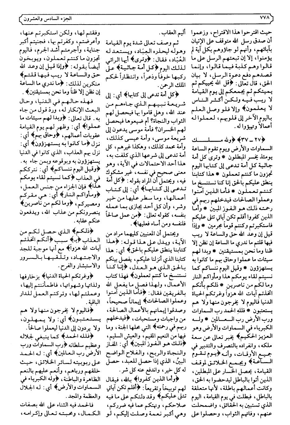 {27-37} {وَلِلَّهِ مُلْكُ السَّمَاوَاتِ وَالأرْضِ وَيَوْمَ تَقُومُ السَّاعَةُ يَوْمَئِذٍ يَخْسَرُ الْمُبْطِلُونَ * وَتَرَى كُلَّ أُمَّةٍ جَاثِيَةً كُلُّ أُمَّةٍ تُدْعَى إِلَى كِتَابِهَا الْيَوْمَ تُجْزَوْنَ مَا كُنْتُمْ تَعْمَلُونَ * هَذَا كِتَابُنَا يَنْطِقُ عَلَيْكُمْ بِالْحَقِّ إِنَّا كُنَّا نَسْتَنْسِخُ مَا كُنْتُمْ تَعْمَلُونَ * فَأَمَّا الَّذِينَ آمَنُوا وَعَمِلُوا الصَّالِحَاتِ فَيُدْخِلُهُمْ رَبُّهُمْ فِي رَحْمَتِهِ ذَلِكَ هُوَ الْفَوْزُ الْمُبِينُ * وَأَمَّا الَّذِينَ كَفَرُوا أَفَلَمْ تَكُنْ آيَاتِي تُتْلَى عَلَيْكُمْ فَاسْتَكْبَرْتُمْ وَكُنْتُمْ قَوْمًا مُجْرِمِينَ * وَإِذَا قِيلَ إِنَّ وَعْدَ اللَّهِ حَقٌّ وَالسَّاعَةُ لا رَيْبَ فِيهَا قُلْتُمْ مَا نَدْرِي مَا السَّاعَةُ إِنْ نَظُنُّ إِلا ظَنًّا وَمَا نَحْنُ بِمُسْتَيْقِنِينَ} .