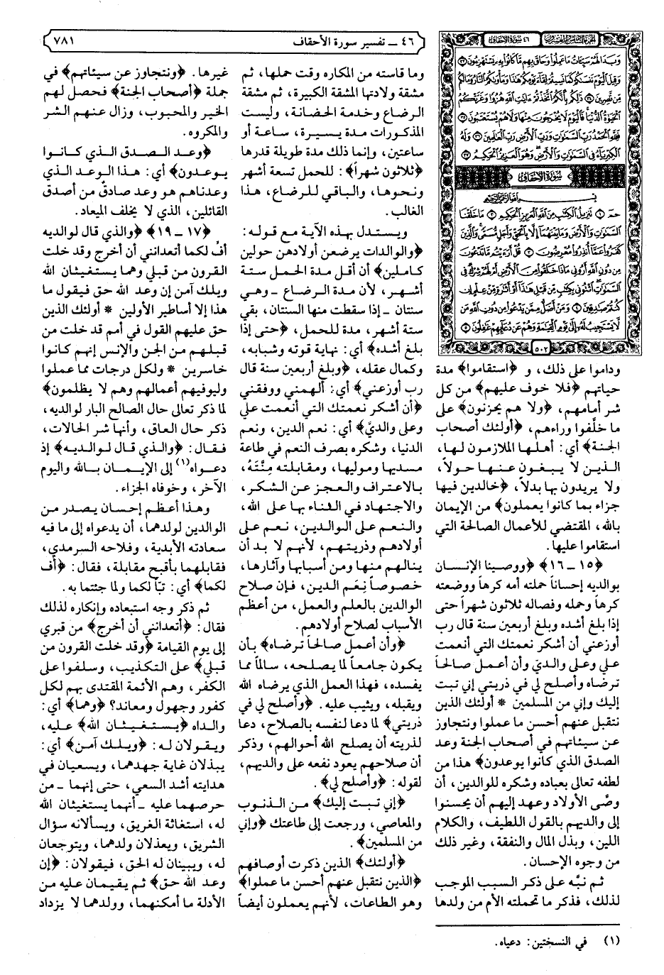 {15-16} {وَوَصَّيْنَا الإنْسَانَ بِوَالِدَيْهِ إِحْسَانًا حَمَلَتْهُ أُمُّهُ كُرْهًا وَوَضَعَتْهُ كُرْهًا وَحَمْلُهُ وَفِصَالُهُ ثَلاثُونَ شَهْرًا حَتَّى إِذَا بَلَغَ أَشُدَّهُ وَبَلَغَ أَرْبَعِينَ سَنَةً قَالَ رَبِّ أَوْزِعْنِي أَنْ أَشْكُرَ نِعْمَتَكَ الَّتِي أَنْعَمْتَ عَلَيَّ وَعَلَى وَالِدَيَّ وَأَنْ أَعْمَلَ صَالِحًا تَرْضَاهُ وَأَصْلِحْ لِي فِي ذُرِّيَّتِي إِنِّي تُبْتُ إِلَيْكَ وَإِنِّي مِنَ الْمُسْلِمِينَ * أُولَئِكَ الَّذِينَ نَتَقَبَّلُ عَنْهُمْ أَحْسَنَ مَا عَمِلُوا وَنَتَجاوَزُ عَنْ سَيِّئَاتِهِمْ فِي أَصْحَابِ الْجَنَّةِ وَعْدَ الصِّدْقِ الَّذِي كَانُوا يُوعَدُونَ} .