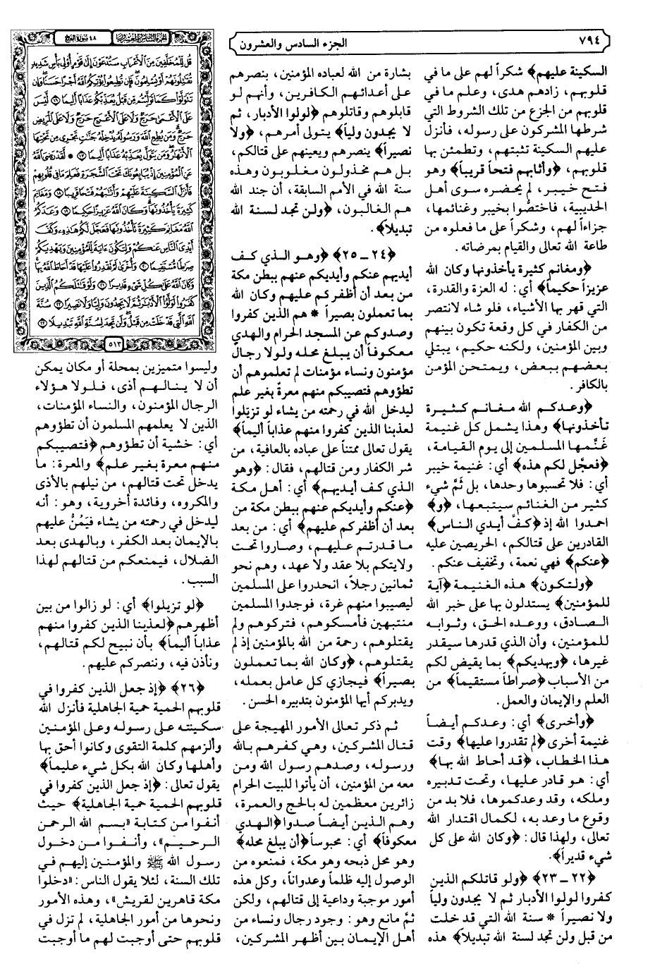 {24-25} {وَهُوَ الَّذِي كَفَّ أَيْدِيَهُمْ عَنْكُمْ وَأَيْدِيَكُمْ عَنْهُمْ بِبَطْنِ مَكَّةَ مِنْ بَعْدِ أَنْ أَظْفَرَكُمْ عَلَيْهِمْ وَكَانَ اللَّهُ بِمَا تَعْمَلُونَ بَصِيرًا * هُمُ الَّذِينَ كَفَرُوا وَصَدُّوكُمْ عَنِ الْمَسْجِدِ الْحَرَامِ وَالْهَدْيَ مَعْكُوفًا أَنْ يَبْلُغَ مَحِلَّهُ وَلَوْلا رِجَالٌ مُؤْمِنُونَ وَنِسَاءٌ مُؤْمِنَاتٌ لَمْ تَعْلَمُوهُمْ أَنْ تَطَئُوهُمْ فَتُصِيبَكُمْ مِنْهُمْ مَعَرَّةٌ بِغَيْرِ عِلْمٍ لِيُدْخِلَ اللَّهُ فِي رَحْمَتِهِ مَنْ يَشَاءُ لَوْ تَزَيَّلُوا لَعَذَّبْنَا الَّذِينَ كَفَرُوا مِنْهُمْ عَذَابًا أَلِيمًا} .