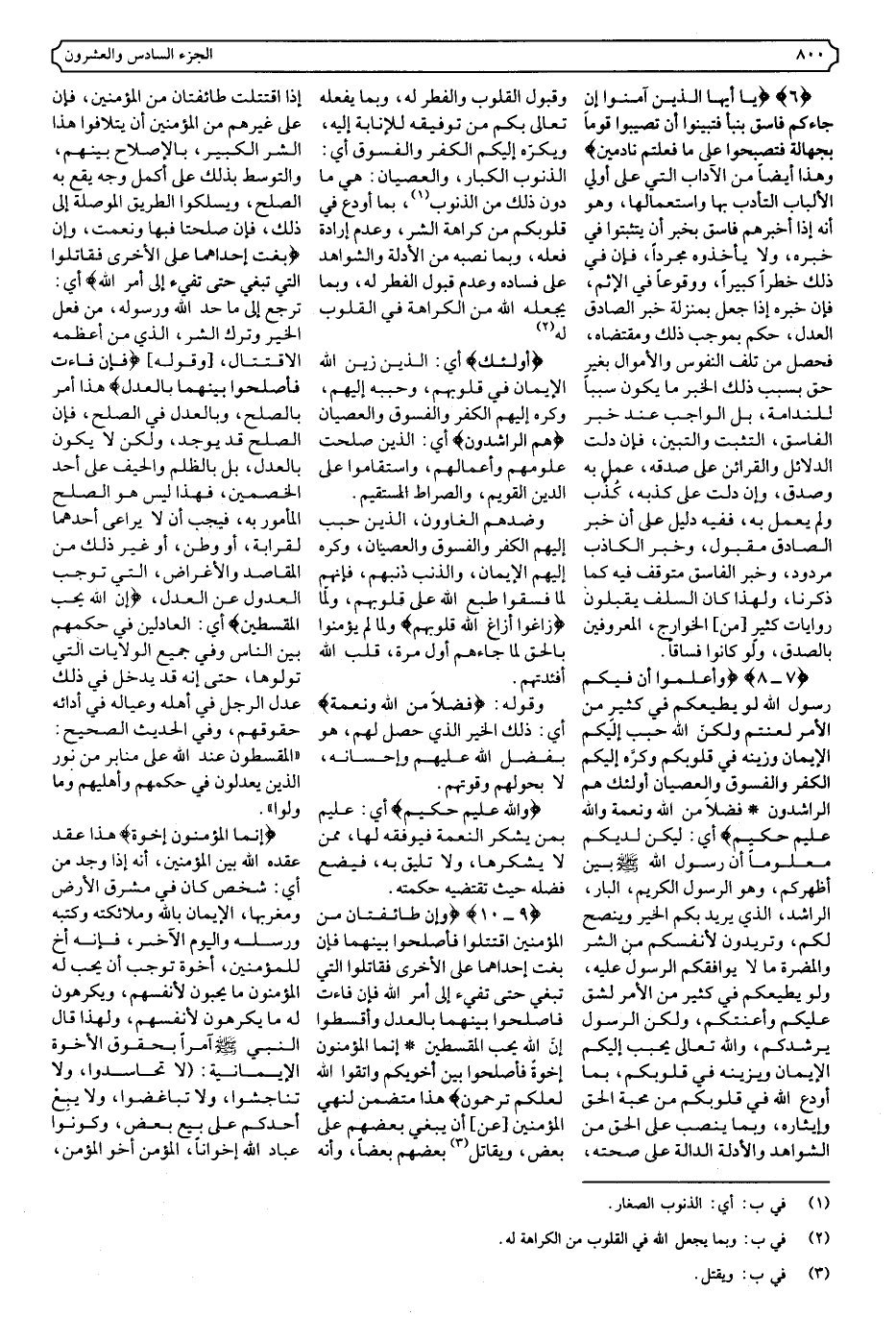 {9-10} {وَإِنْ طَائِفَتَانِ مِنَ الْمُؤْمِنِينَ اقْتَتَلُوا فَأَصْلِحُوا بَيْنَهُمَا فَإِنْ بَغَتْ إِحْدَاهُمَا عَلَى الأخْرَى فَقَاتِلُوا الَّتِي تَبْغِي حَتَّى تَفِيءَ إِلَى أَمْرِ اللَّهِ فَإِنْ فَاءَتْ فَأَصْلِحُوا بَيْنَهُمَا بِالْعَدْلِ وَأَقْسِطُوا إِنَّ اللَّهَ يُحِبُّ الْمُقْسِطِينَ * إِنَّمَا الْمُؤْمِنُونَ إِخْوَةٌ فَأَصْلِحُوا بَيْنَ أَخَوَيْكُمْ وَاتَّقُوا اللَّهَ لَعَلَّكُمْ تُرْحَمُونَ} .